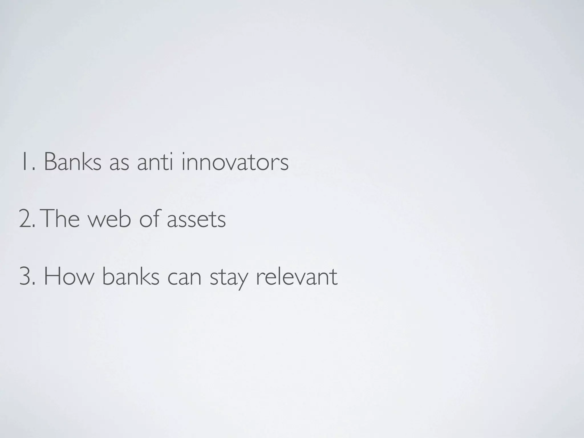 This document discusses the challenges banks pose for financial technology startups and how banks can stay relevant in a changing landscape. It notes that banks often charge high fees and make it difficult for startups to access basic services. New types of digital assets now exist outside the traditional banking system. The document proposes that banks create experimental web-based banks with open APIs, minimal KYC requirements, and no cards to better serve customers and startups. It suggests banks learn from large internet companies and acquire innovative startups to help drive innovation.