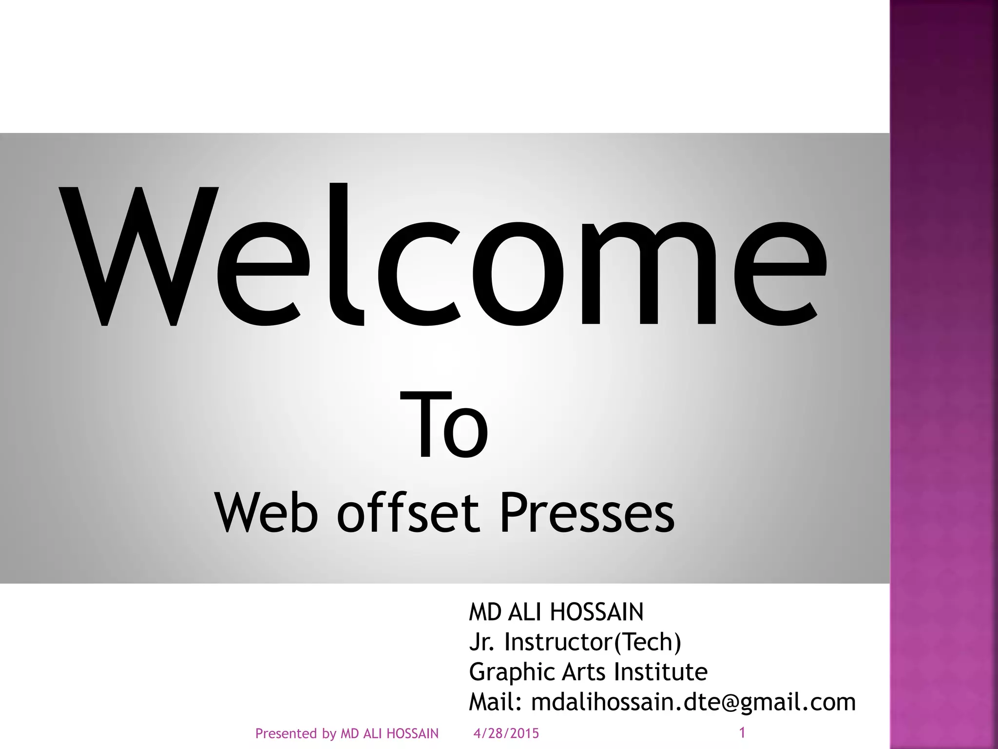 The document discusses web offset printing. Web offset printing uses a continuous roll of paper fed through the printing press. There are two methods of drying - heat set uses forced air heating to dry ink rapidly, while cold set relies on natural evaporation and absorption to dry ink more slowly. The document focuses on web offset printing, describing characteristics like high printing speeds up to 900 meters per minute and applications including books, magazines, newspapers, and catalogs.