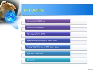 This document discusses a case study of the International Management Institute Bhubaneswar (IMIB) library's implementation of a Web OPAC (Online Public Access Catalog). It provides details on the IMIB library's collections and services. Usage statistics show that the majority of students, faculty, and staff use the Web OPAC to search for books by title. The Web OPAC allows users to easily find information on books and their availability, locations, and details from anywhere via the internet. It has increased awareness of the library's resources and made searching and accessing information more convenient for IMIB library patrons.