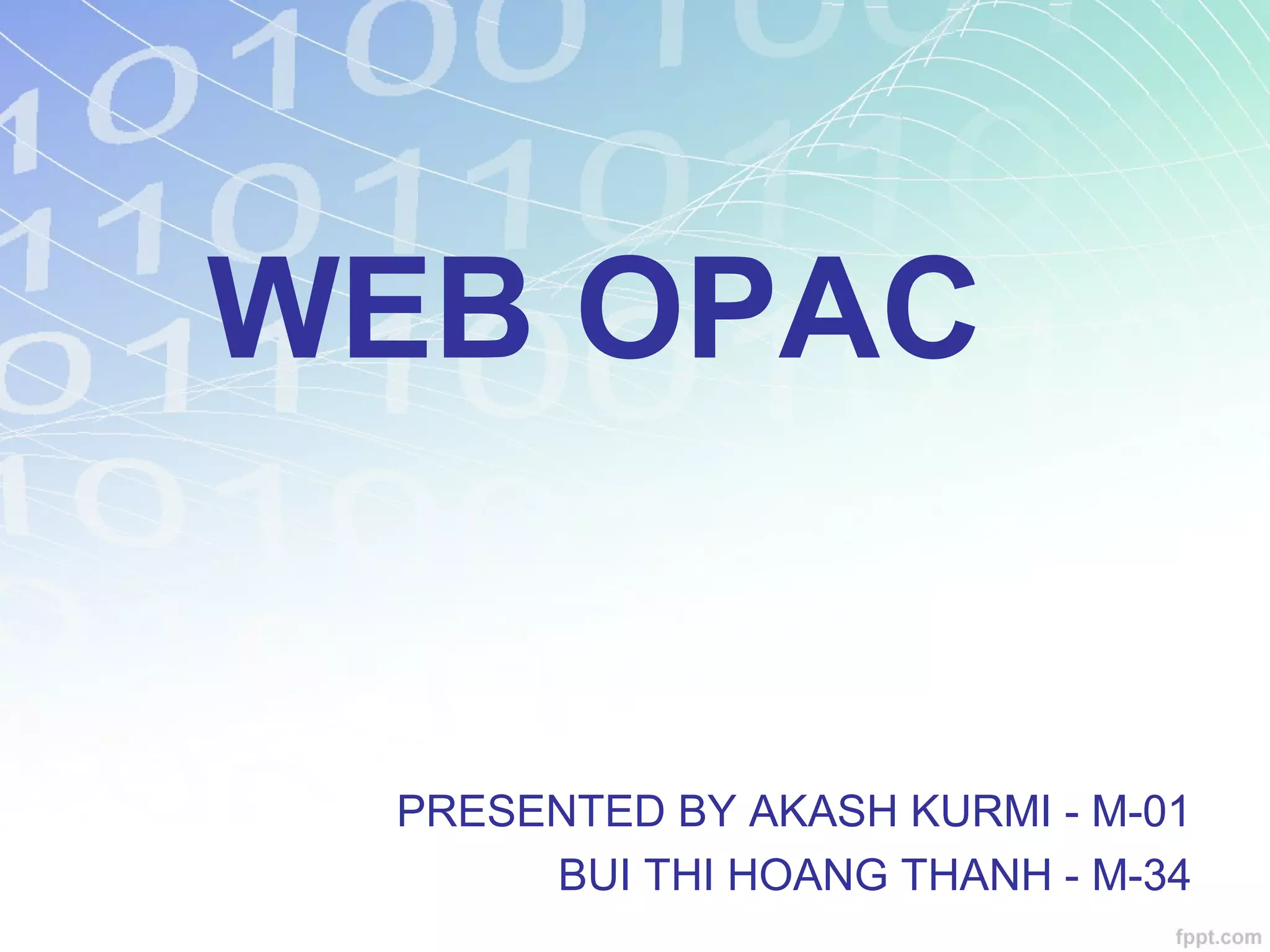 This document provides an overview of Web OPAC (Online Public Access Catalog). It begins by explaining how OPAC systems improved upon traditional card catalogs by allowing users to search library collections via computer. It then defines key terms like catalog, OPAC, and Web OPAC. The document discusses the history of OPAC systems from 1st to 3rd generation and compares features of OPAC and Web OPAC. It also outlines searching capabilities, access points, advantages, and limitations of Web OPAC before concluding with examples of Web OPAC implementations in India.