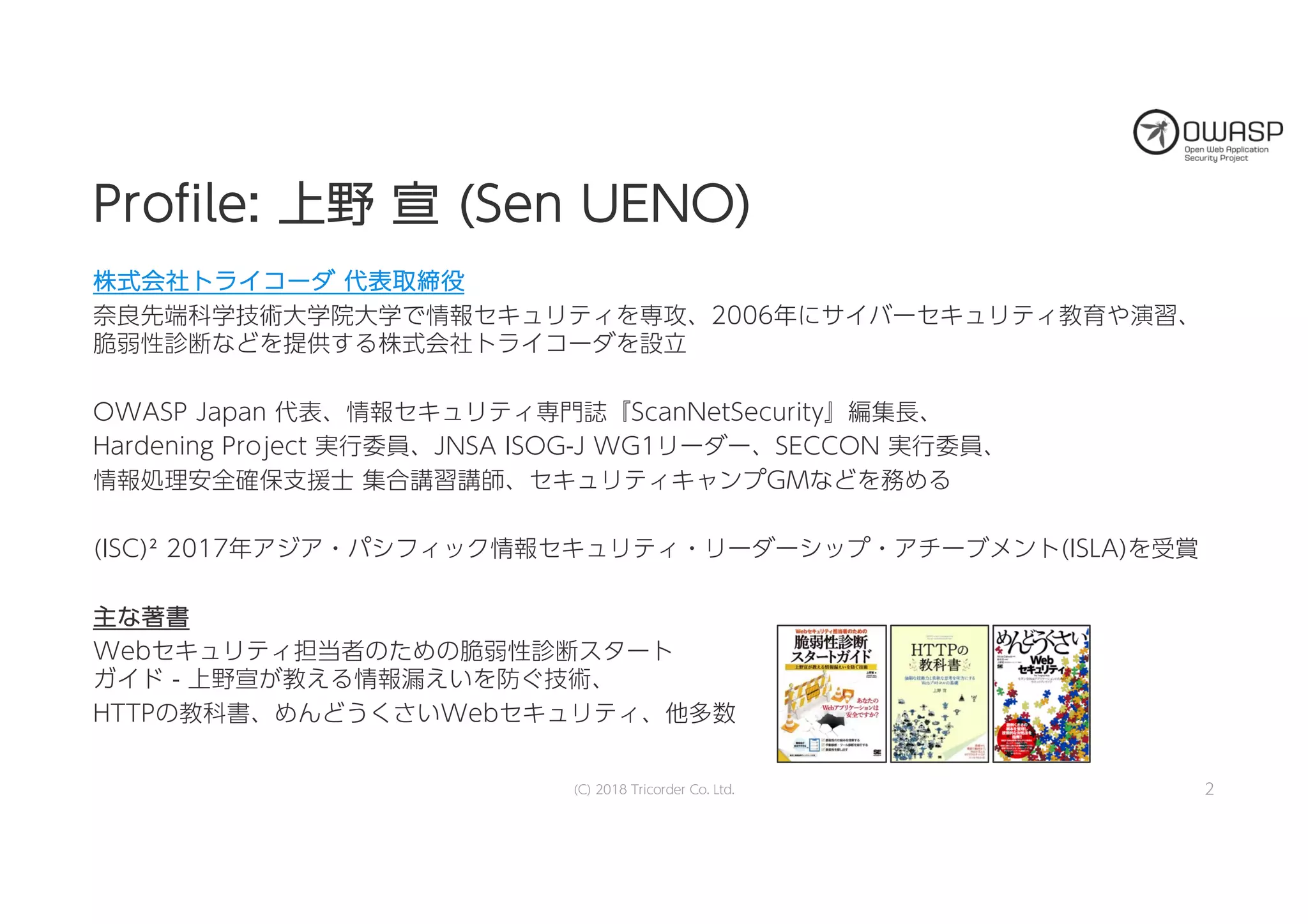 脆弱性診断士スキルマッププロジェクトの話やペネトレーションテスト(Penetration testing / Red Team)、SQLインジェクション、脆弱性診断の実施手順などを紹介しています。