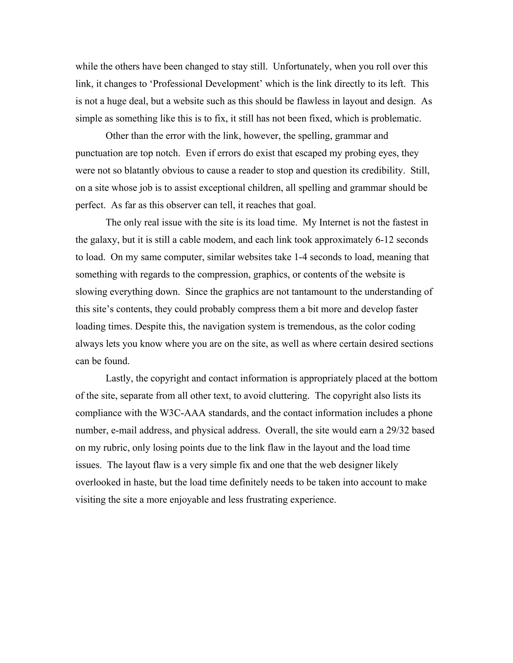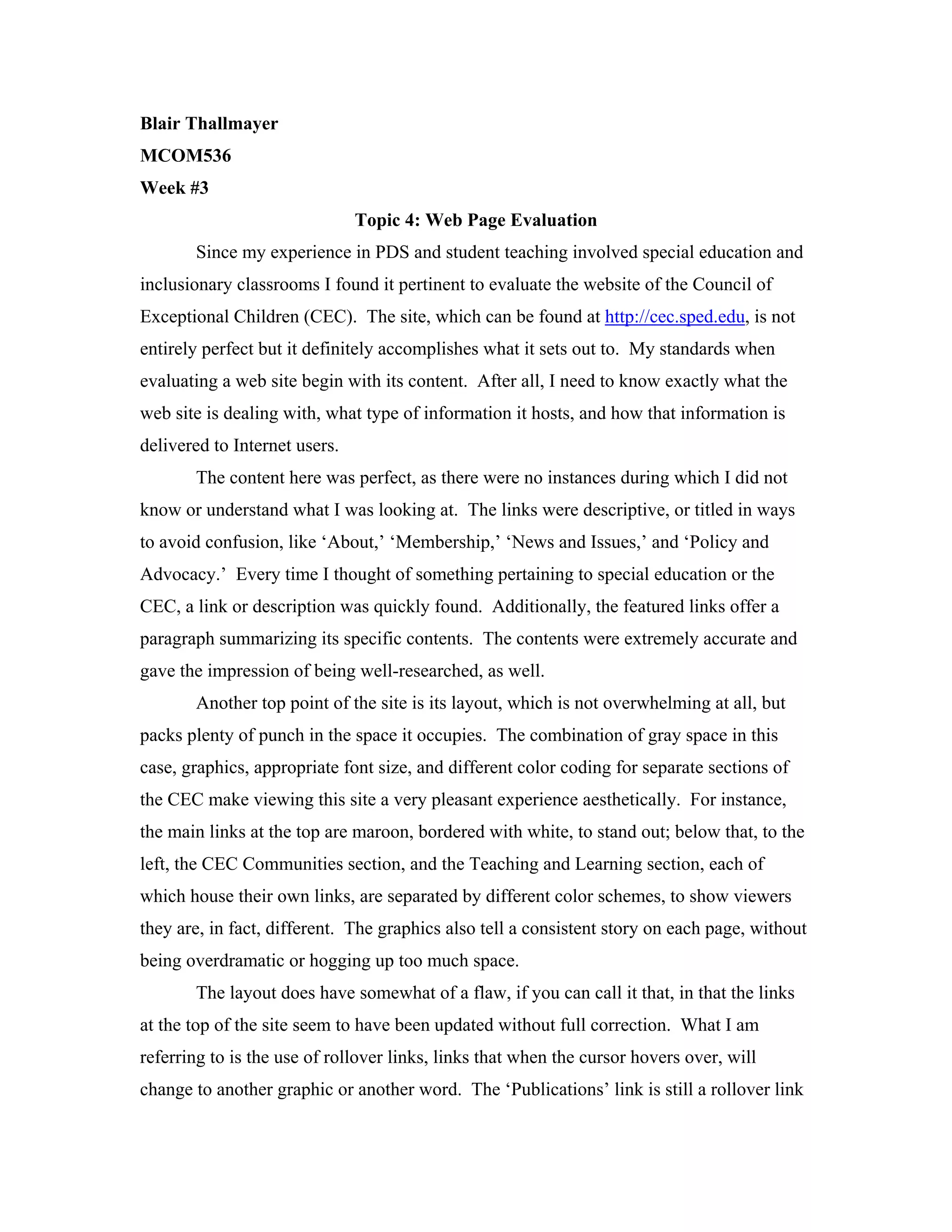 The document evaluates the website of the Council of Exceptional Children (CEC) based on various criteria such as content, layout, spelling/grammar, load time, and navigation. Overall, the evaluator found the content and layout of the site to be well-done, though some minor issues were noted with a broken link and slow load times. Conducting thorough website evaluations is important for technology coordinators to ensure educators and students are using appropriate online resources.