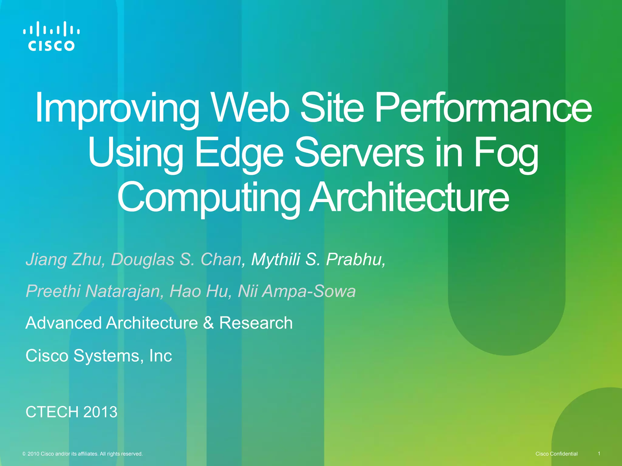 This document discusses improving website performance using edge servers within a fog computing architecture, presenting various optimization techniques that can lead to significant reductions in page size and load time. It highlights the importance of tailoring optimizations based on client device capabilities, network characteristics, and user experiences to enhance overall performance. Additionally, it outlines specific recommendations and methodologies for achieving optimization goals in web applications.