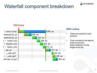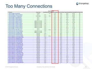 - A case study showing how automation identified issues like too many connections, bytes, and roundtrips on a site and incrementally improved performance through techniques like caching, CDNs, minification, and domain sharding.