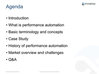 - The history and evolution of the performance automation market from delivery to more advanced transformation tools. Challenges include supporting new technologies and standardizing measurements. Speed remains an important opportunity area.