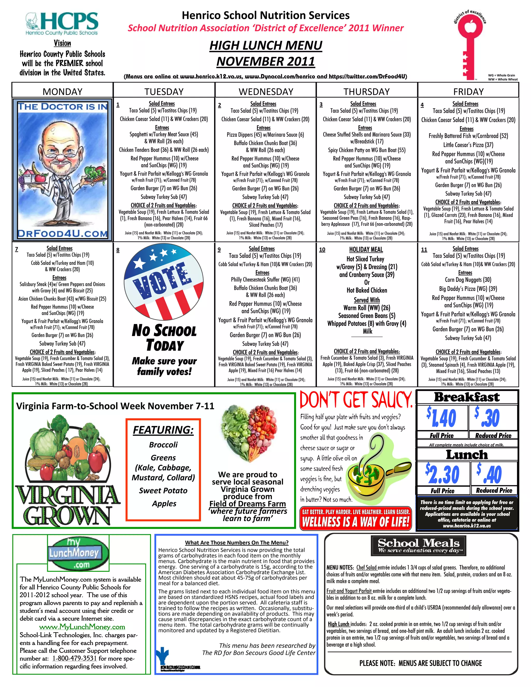 The document is a menu for Henrico County Public Schools' elementary school lunches for November 2011. It lists the entrees, sides, fruits and vegetables that will be served each day. Henrico School Nutrition Services was named the School Nutrition Association's District of Excellence in 2011. The menu provides nutritional information like carbohydrate counts and notes about what constitutes a complete meal.