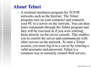 Telnet is a terminal emulation program that allows users to connect their PC to a server on a TCP/IP network like the Internet. This enables users to enter commands on the server as if they were directly accessing the server's console. NVT refers to a virtual terminal with keyboard and printer capabilities defined in RFC854. IP addresses distinguish between the network and host portions of an address using a subnet mask. Routers relay data between networks by analyzing network and transport layer protocols to determine the best path for data transfer.