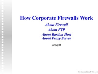 A firewall is a system that prevents unauthorized access to a company's computer network from the outside. It monitors data flowing in and out and intercepts unjust access. A bastion host is a specially hardened computer located in the DMZ or outside the firewall that hosts a single application like a proxy server and has all other services removed or limited. A proxy server acts as an intermediary for requests from clients to external servers by evaluating requests according to filtering rules and optionally altering requests or responses.