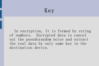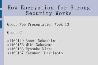 Group C presents on encryption and how it provides strong security. Encryption uses a key to encrypt data by combining it with random noise, and only the same key can decrypt it back into the original data. Encryption can protect files on servers and storage, as well as data being transmitted by encrypting the entire data stream between devices using a virtual private network.
