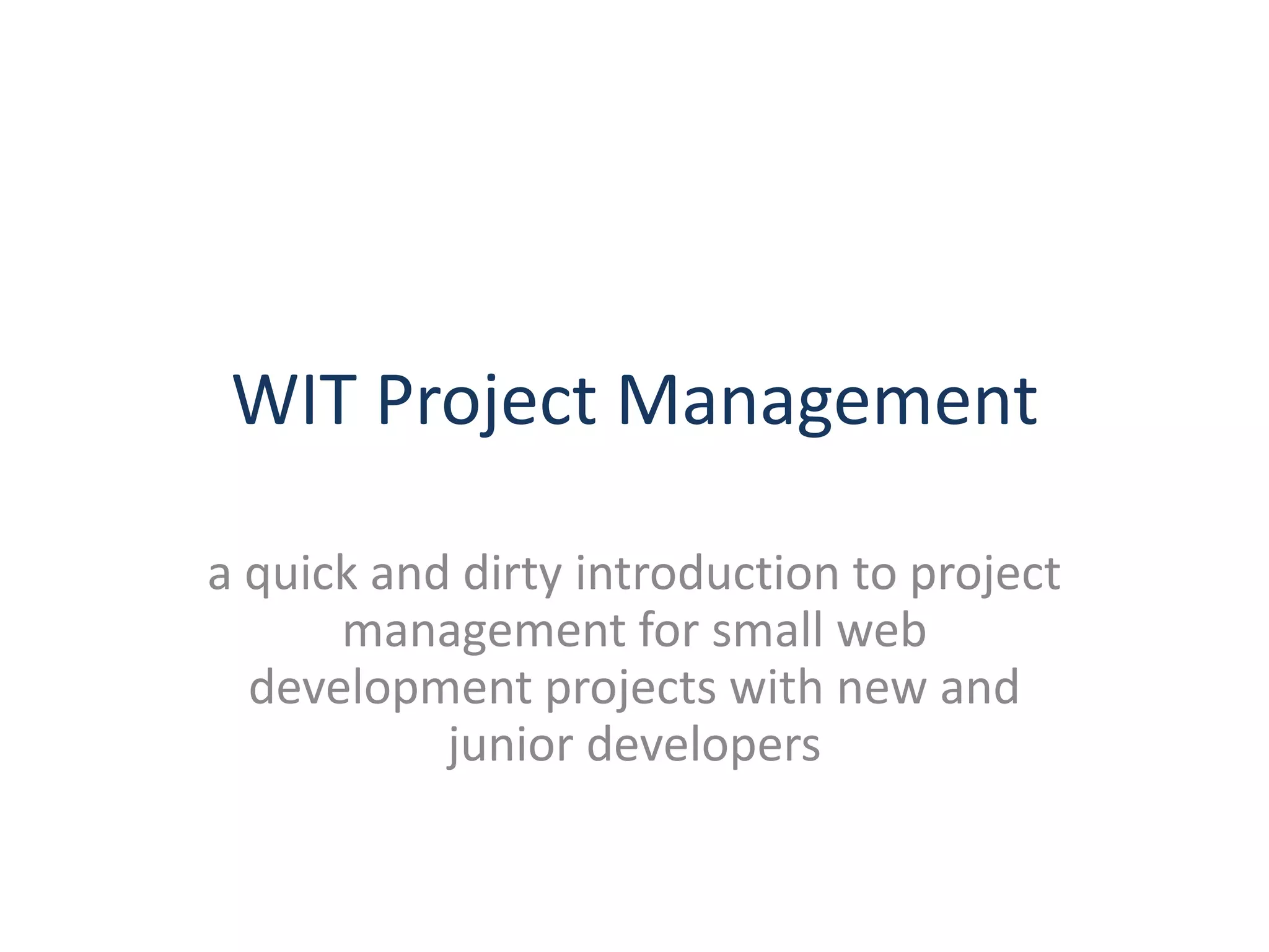 The document serves as a guide for project management tailored specifically for small web development projects, particularly aimed at new and junior developers. It discusses traditional and agile project management methodologies, highlighting their respective strengths and weaknesses, and suggests a hybrid approach that accommodates the unique needs of web/software development. Key emphasis is placed on clear responsibilities, self-organization, and maintaining flexibility while guiding and supporting junior developers throughout the project phases.