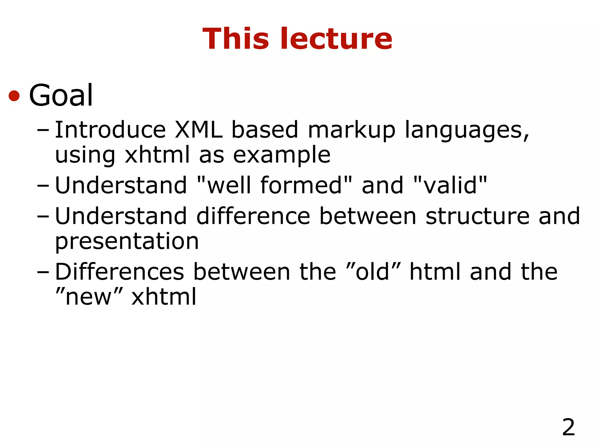 This document introduces XML-based markup languages like XHTML and compares HTML and XHTML. It discusses well-formed and valid markup, hierarchical structure, elements and attributes. XHTML separates structure from presentation and uses CSS for layout. Documents can be validated to check they conform to XHTML standards.