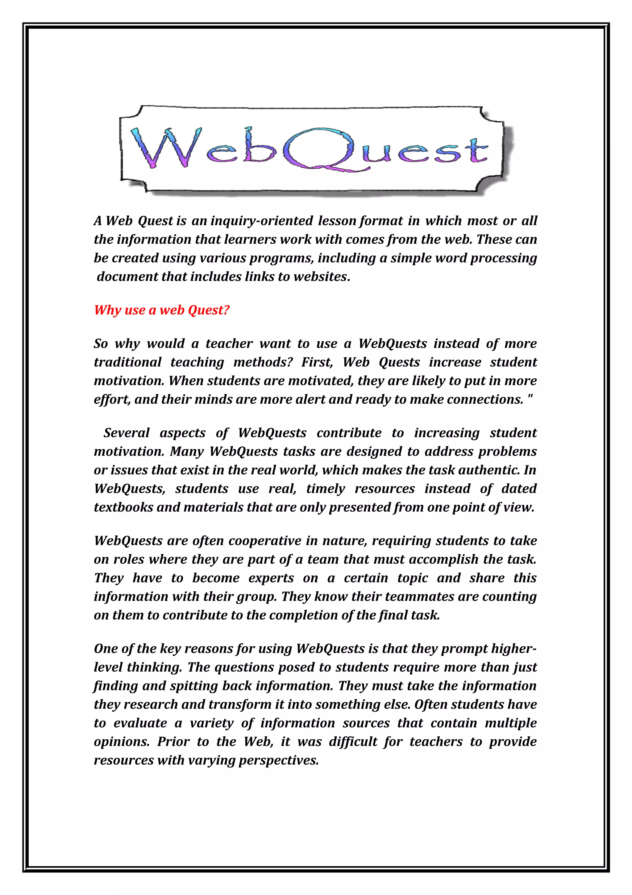 A Web Quest is an inquiry-based lesson that uses mostly online resources to guide students through an investigation. Web Quests aim to increase student motivation by addressing real-world problems from multiple perspectives and requiring cooperative work. They also promote higher-order thinking as students must analyze and synthesize information rather than just recall facts.