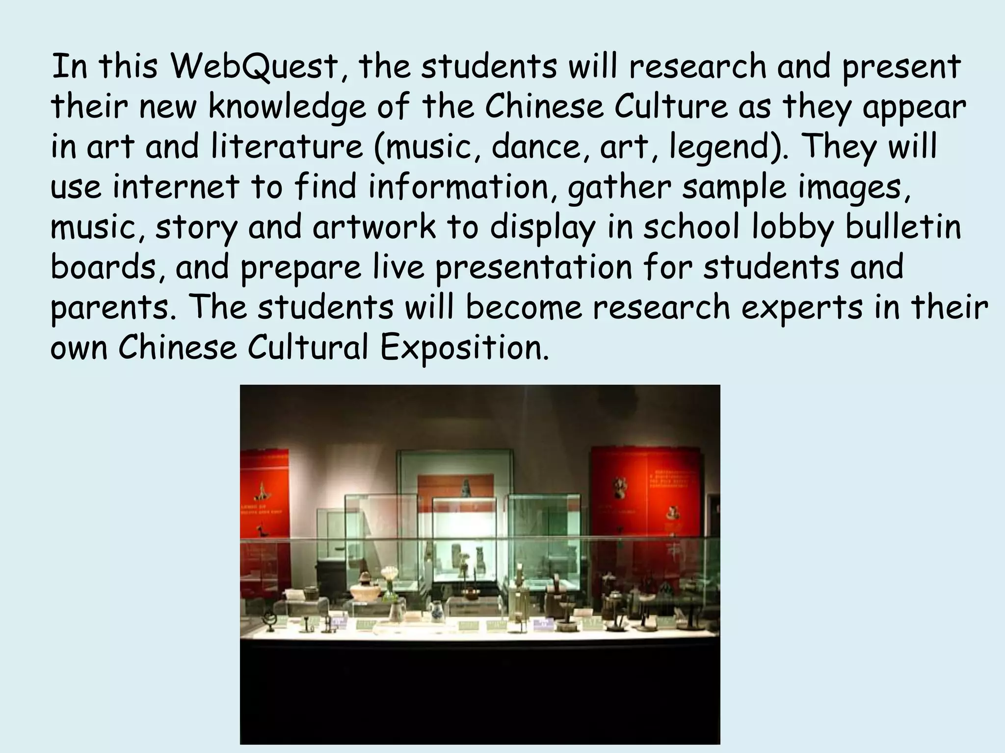 In this project, students will research and present their knowledge of Chinese culture as expressed through various art forms and literature. They will use the internet to find information, images, music, stories and artworks to display in school lobby exhibits and presentations for students and parents. Students will each specialize in one theme of Chinese culture - such as art, festivals, music, or dance - and work with peers to design an exhibit area focused on their theme. On opening night, students will give speeches as docents to discuss and reflect on the works presented in the exhibit.