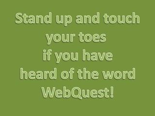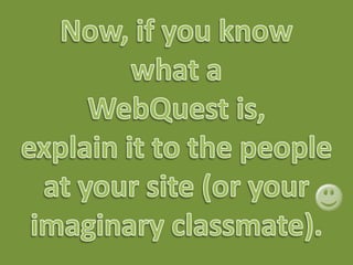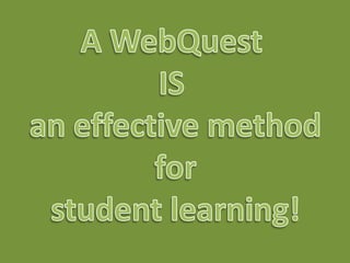 The document discusses how WebQuests can help students meet NCTE/IRA Standard 8 by having them use various technological and information resources to gather, synthesize, create, and communicate knowledge. It provides examples of a past WebQuest on fables that had students use resources like wikis, databases, and presentation tools. The WebQuest allowed students to work collaboratively to research fables, create an original one using digital tools, and share their work. Insights from implementing the fable WebQuest and potential new questions about differentiating instruction with WebQuests are also included.