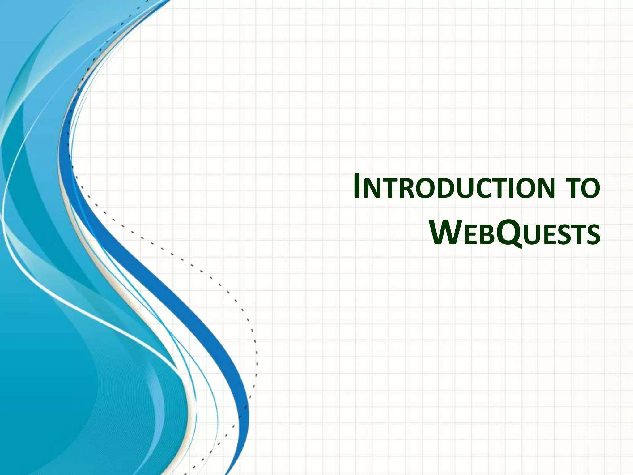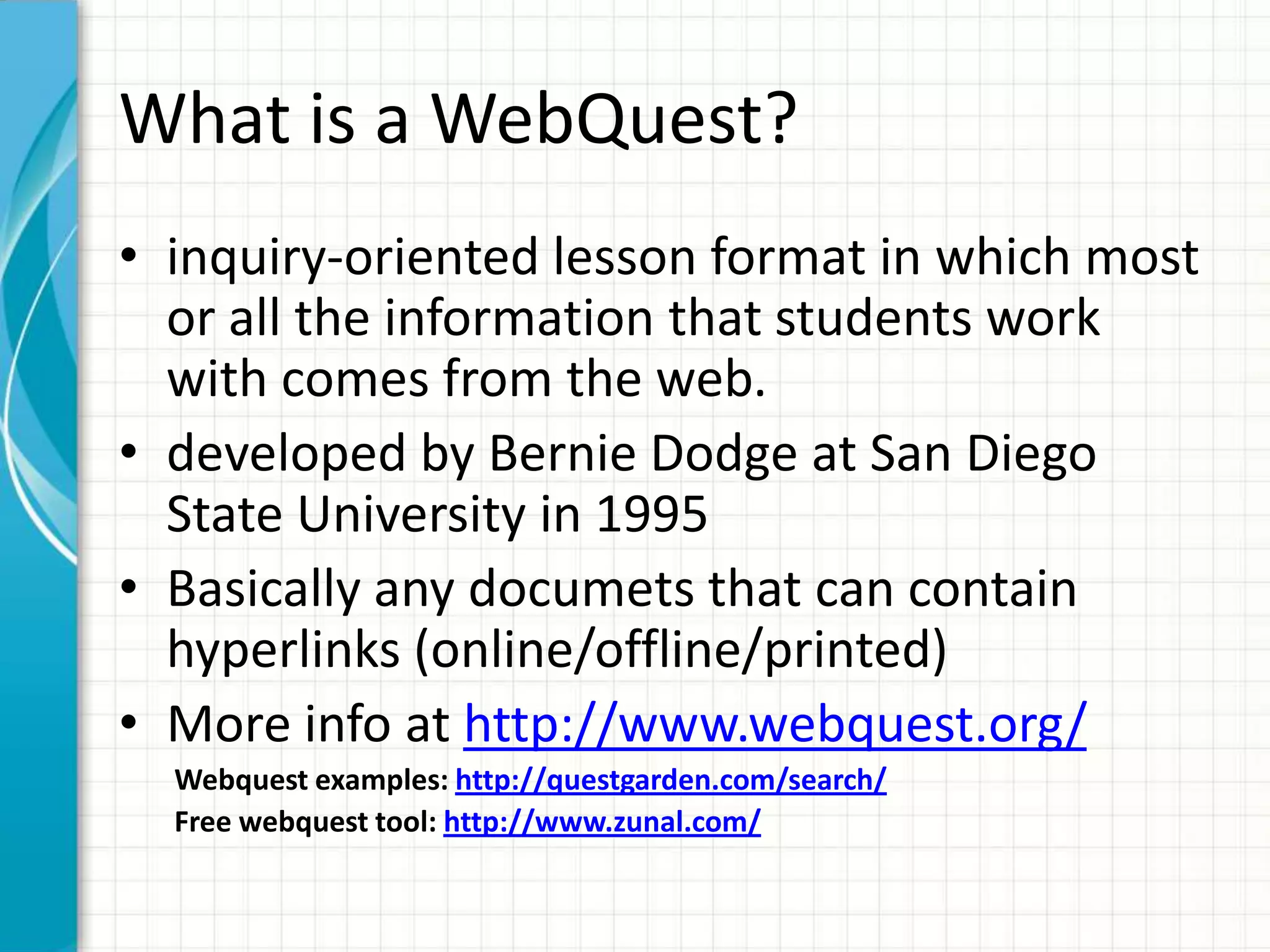 A WebQuest is an inquiry-oriented lesson format that uses mostly online resources for students to investigate an issue or topic. It allows students to assume a role to conduct research. Key elements of a WebQuest include an introduction that engages students, essential questions that guide the task, a process with clearly outlined steps and online resources for students to find information, and an evaluation rubric. Teachers should select an appropriate topic, formulate the essential question and task, find relevant online resources to guide students, and provide a means to assess students' work.