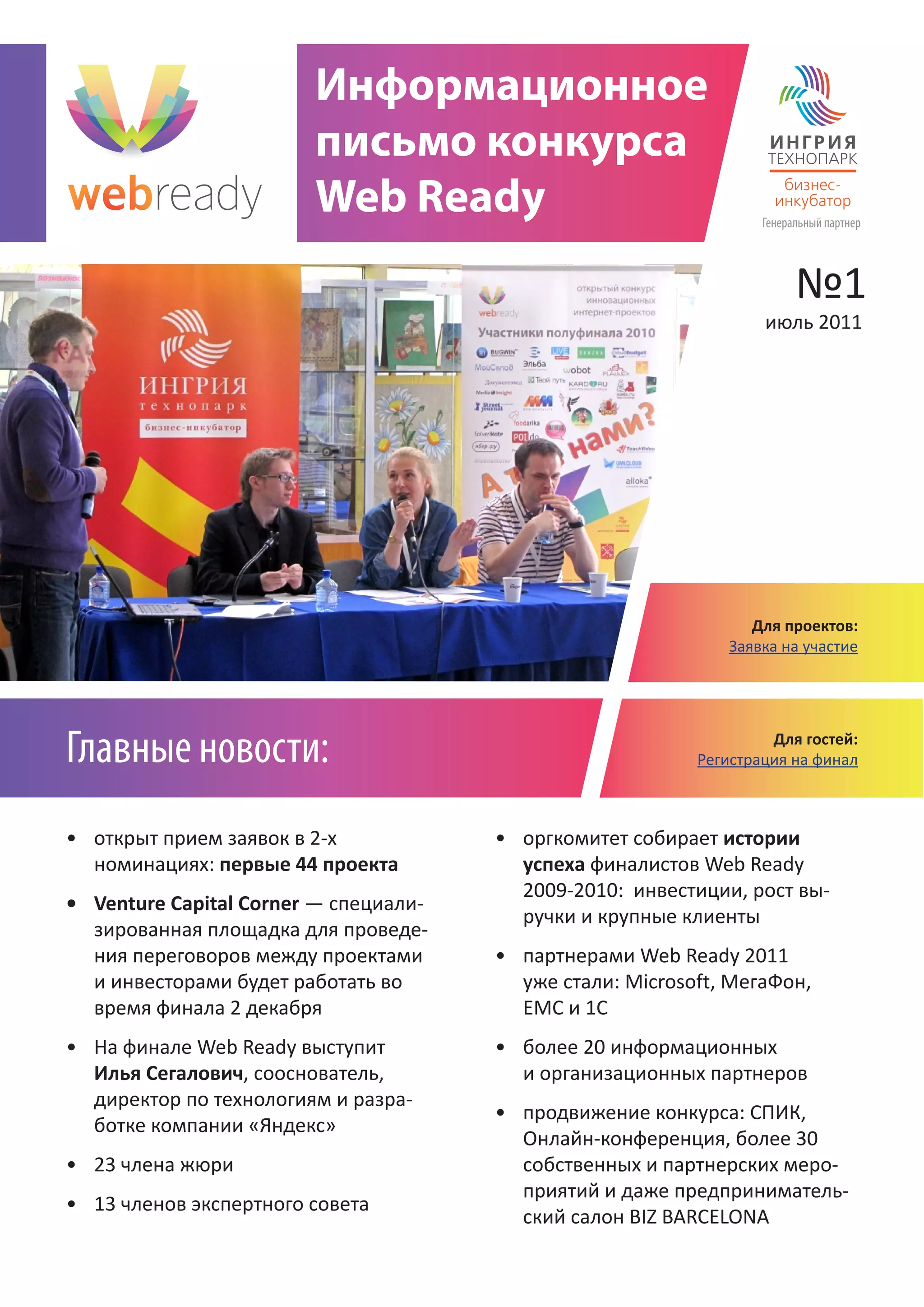 Конкурс Web Ready 2011 является открытым конкурсом для стартапов в области интернет-технологий с призовым фондом 1,5 миллиона рублей, который проводится в формате инвестиционного форума. Прием заявок проходит с 18 апреля по 18 октября, а финал состоится 2 декабря в Санкт-Петербурге, где более 400 участников смогут представить свои проекты перед инвесторами и членами жюри. Среди участников предыдущих конкурсов - более 850 проектов из 14 стран, и уже заявлены первые 44 номинанта для текущего года.