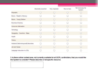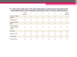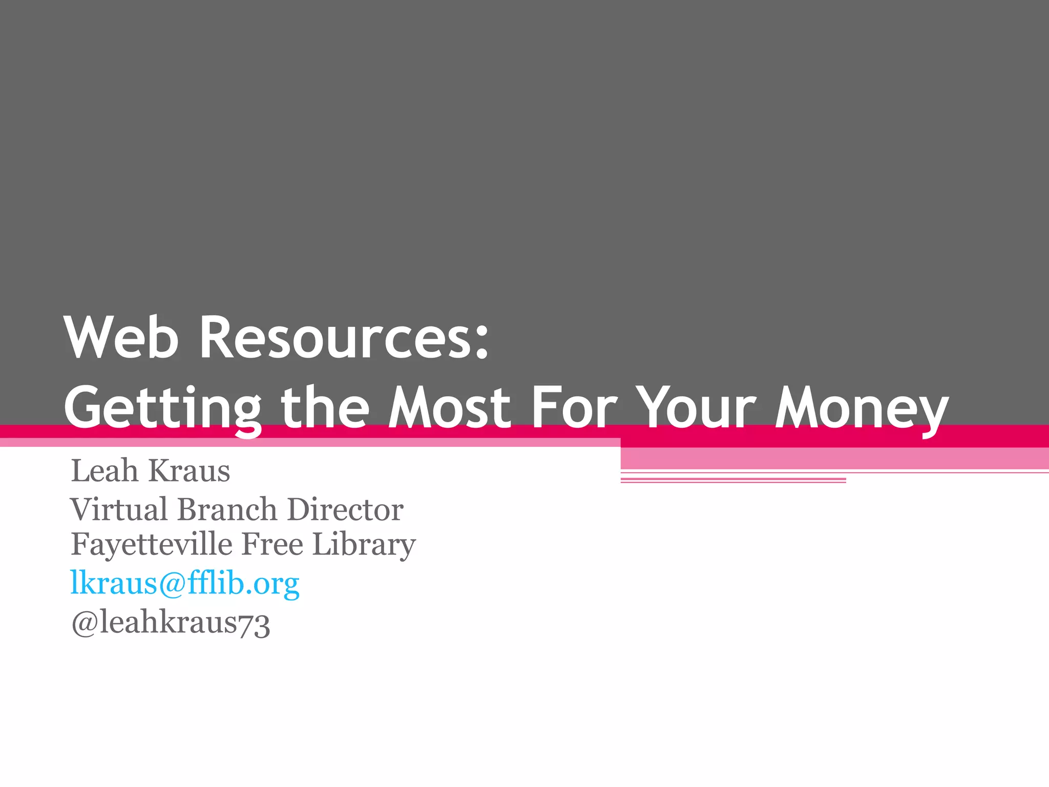 This document discusses strategies for libraries to get the most value from their web resources collections. It recommends benchmarking other libraries, exploring funding options through negotiation and reallocation, evaluating current resources and patron needs, and promoting resources to maximize usage. Key steps include looking at current resources and costs, identifying priority subject areas, exploring alternatives, finding funding, and promoting resources while evaluating usage and needs on an ongoing basis.