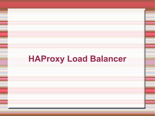 HAProxy is an open source load balancer that can distribute traffic across multiple servers. It can balance both TCP and HTTP-based applications. It is lightweight, widely used, and has features like load balancing algorithms, health checks, failover, and logging. The configuration file haproxy.cfg contains sections for global settings, defaults, listening ports, frontends, and backends to configure load balancing across server pools.