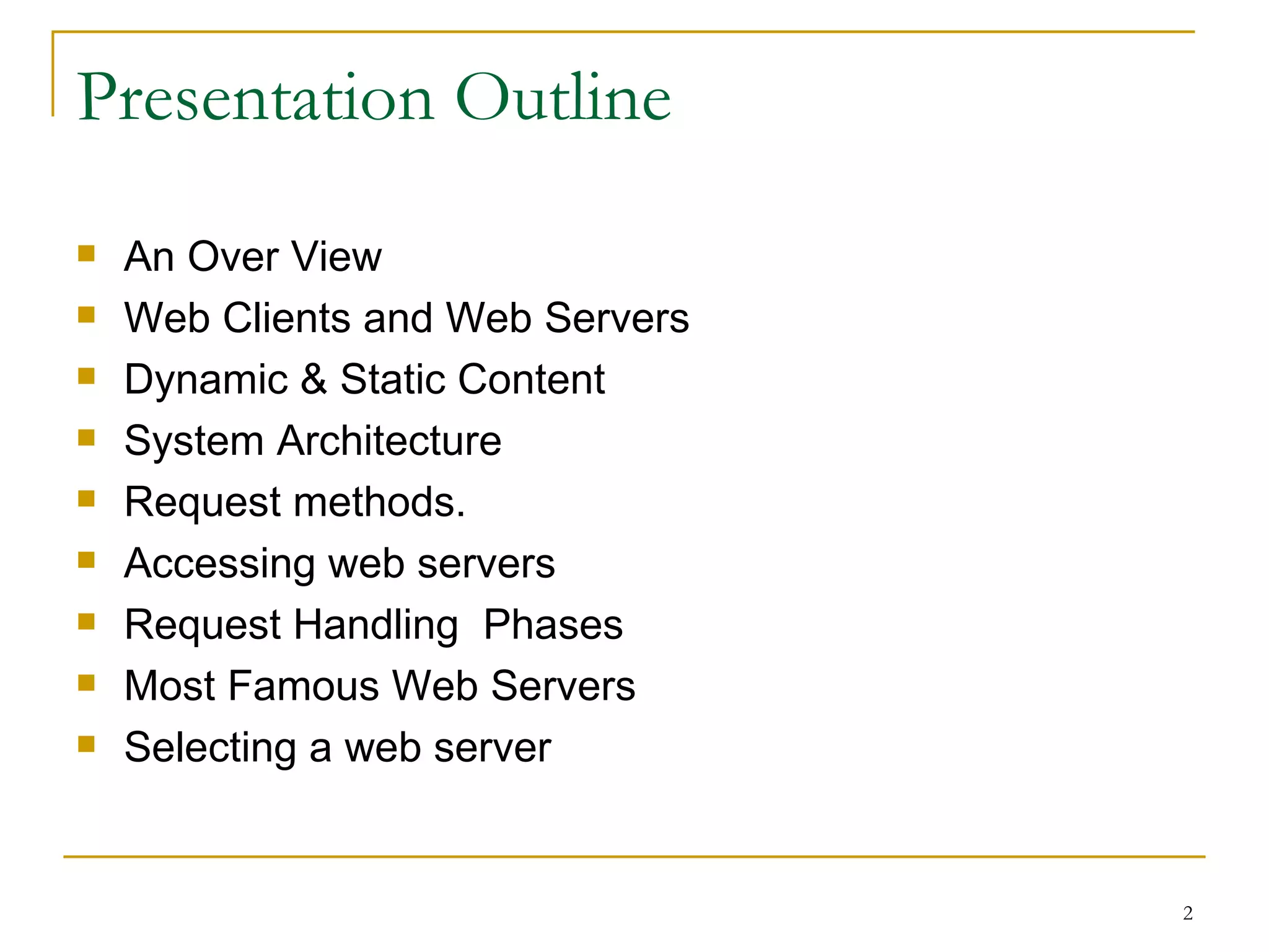 This document discusses web servers. It provides an overview of web clients and web servers, and describes how web servers handle static and dynamic content. The document outlines the typical architecture of a two-tier or three-tier client-server system for delivering web pages. It also discusses the GET and POST request methods, phases of request handling, popular web servers like Apache and IIS, and factors to consider when selecting a web server.