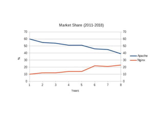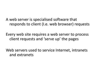 Документ описывает веб-серверы как специализированное программное обеспечение для обработки запросов клиентов, включая их работу с протоколом HTTP и различными статус-кодами ответов. Рассматриваются типы веб-серверов, такие как статические и динамические, а также их архитектура и функции, включая безопасность и поддержку различных технологий. Также рассматривается интеграция серверов, таких как IIS, Apache и Nginx, и их основные функции и настройки.