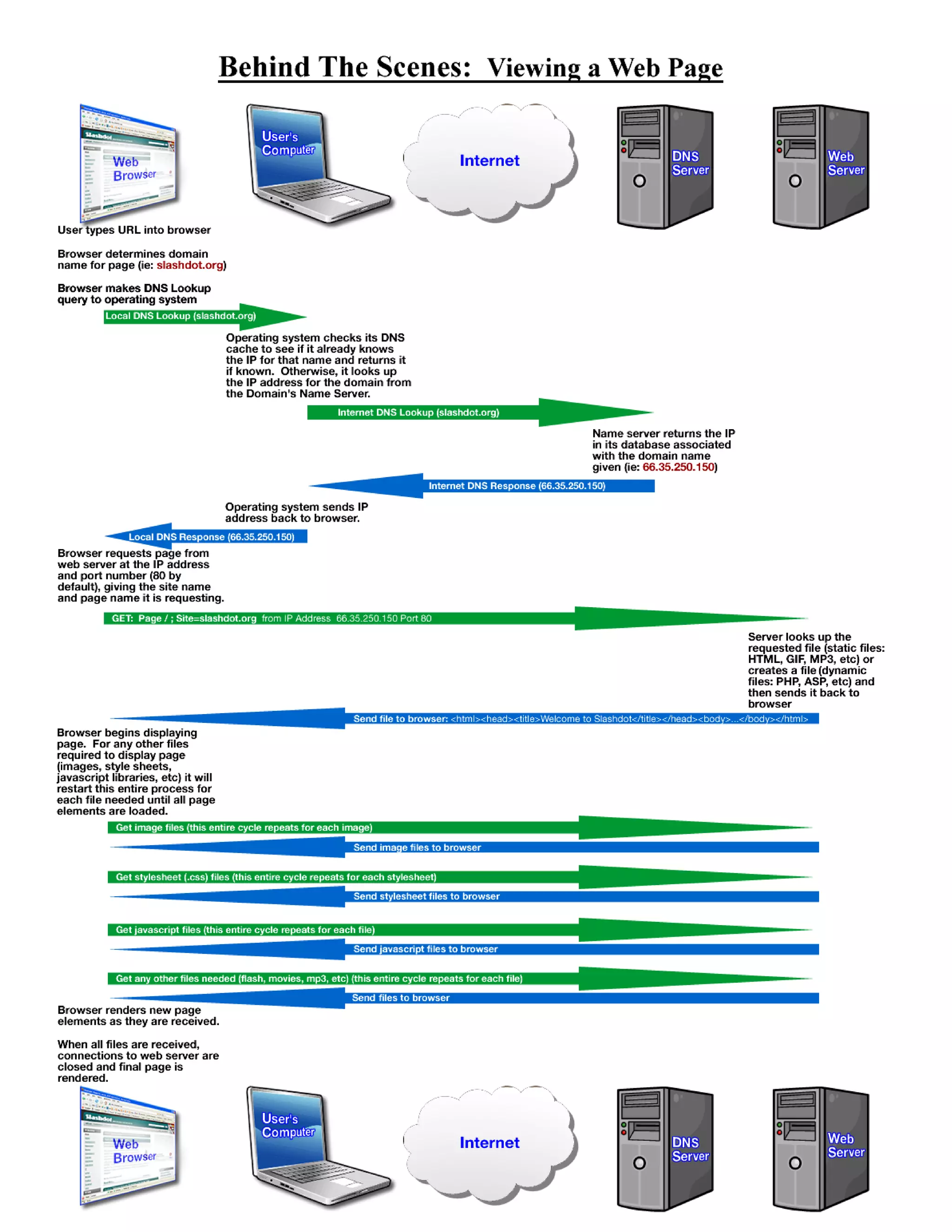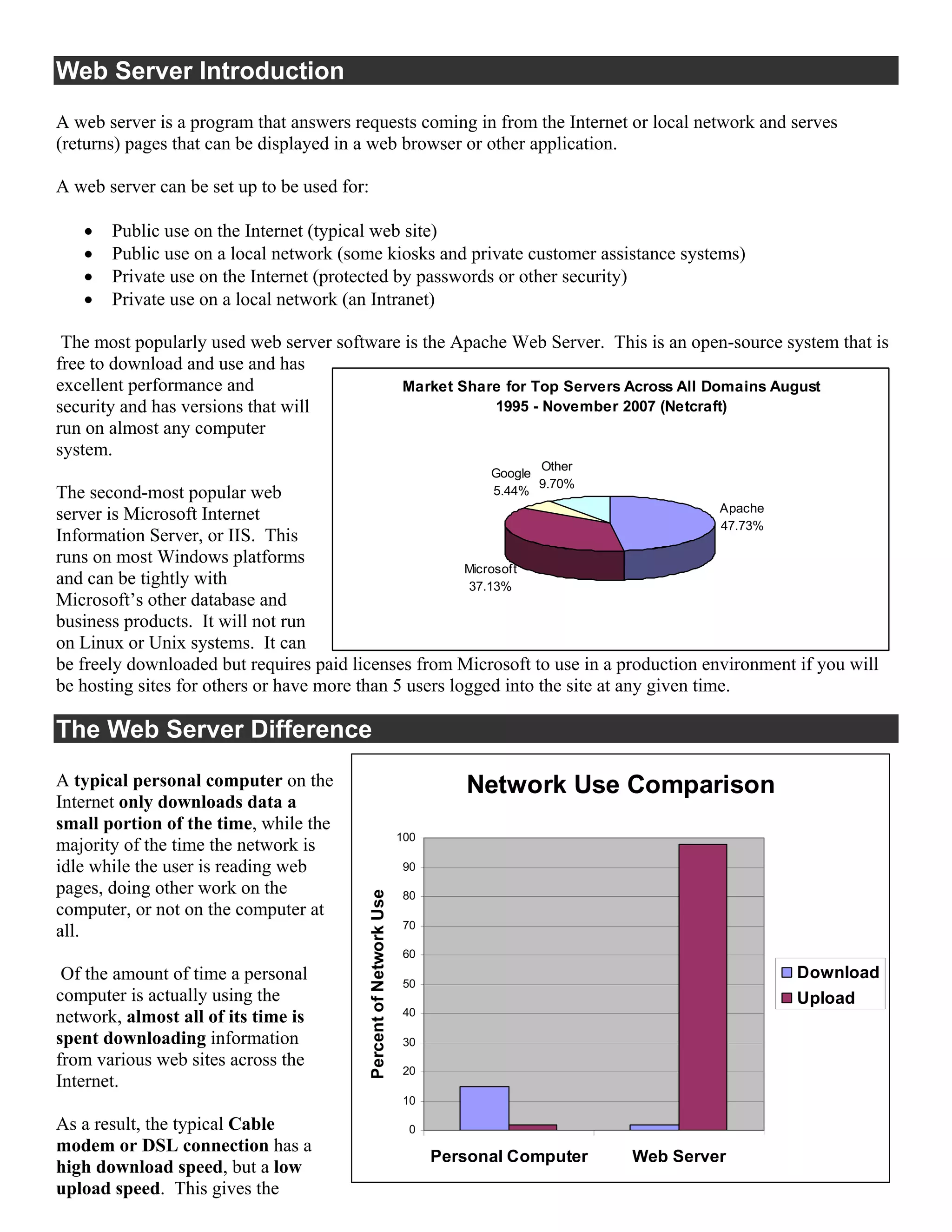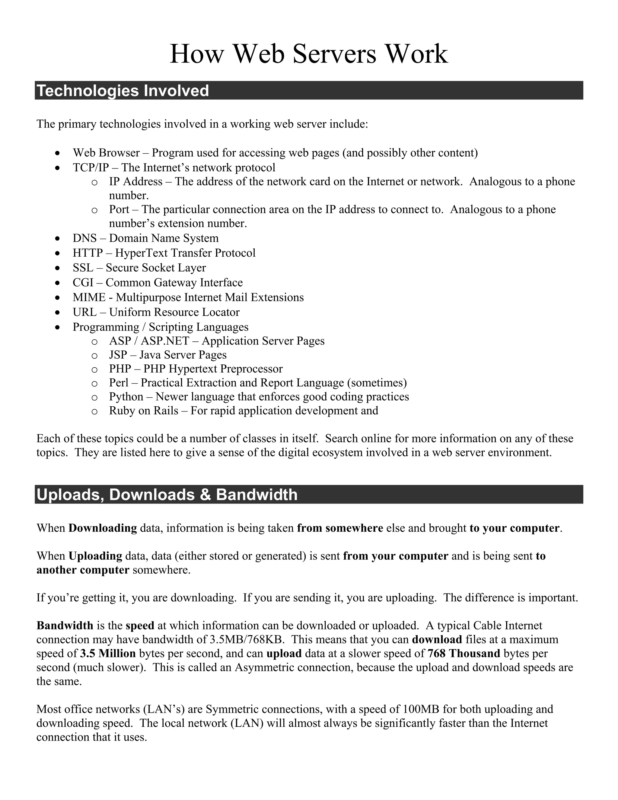 The document discusses how web servers work and the technologies involved, including web browsers, TCP/IP, DNS, HTTP, SSL, CGI, MIME, URLs, programming languages like PHP and ASP.NET. It explains the differences between static and dynamic content, in-process and out-of-process dynamic content execution, and server-side versus client-side execution. Sample code is provided for PHP, ASP, and JavaScript to demonstrate dynamic content generation.