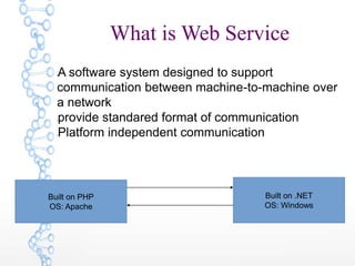 Web services allow programs to communicate over a network. There are two main types: SOAP and REST. SOAP uses XML and HTTP POST, while REST can use HTTP verbs like GET and POST with data formats like JSON or XML. Authentication for web services can be done with basic authentication, tokens, or OAuth. REST follows principles like using resources and URIs, being stateless, and cacheable. SOAP defines an envelope, header, and body for messages in an XML format.