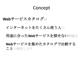 Concept Webサービスカタログは インターネットをたくさん使う人の 用途に合ったWebサービスを探せない問題を Webサービスを集めたカタログで比較する ことで解決します