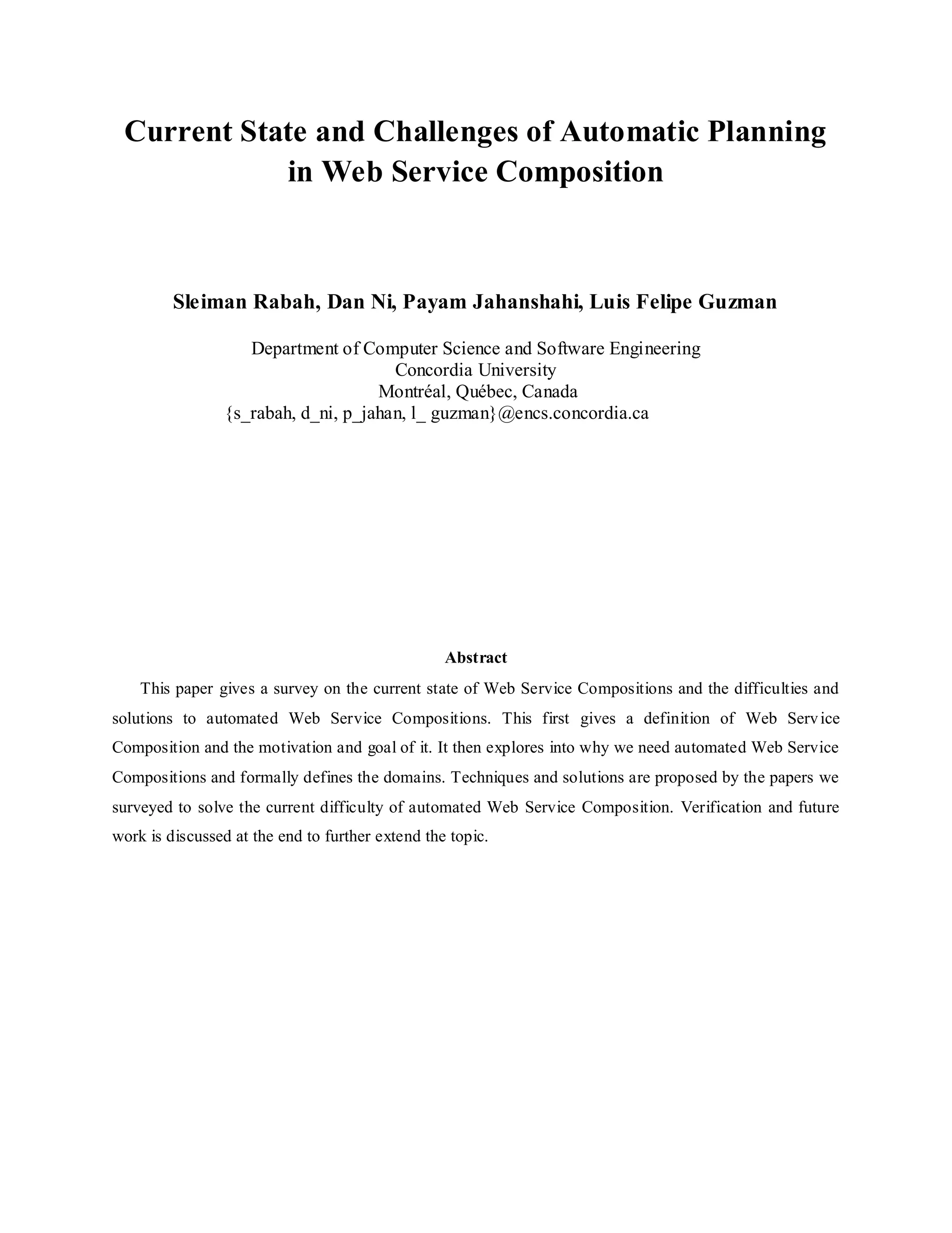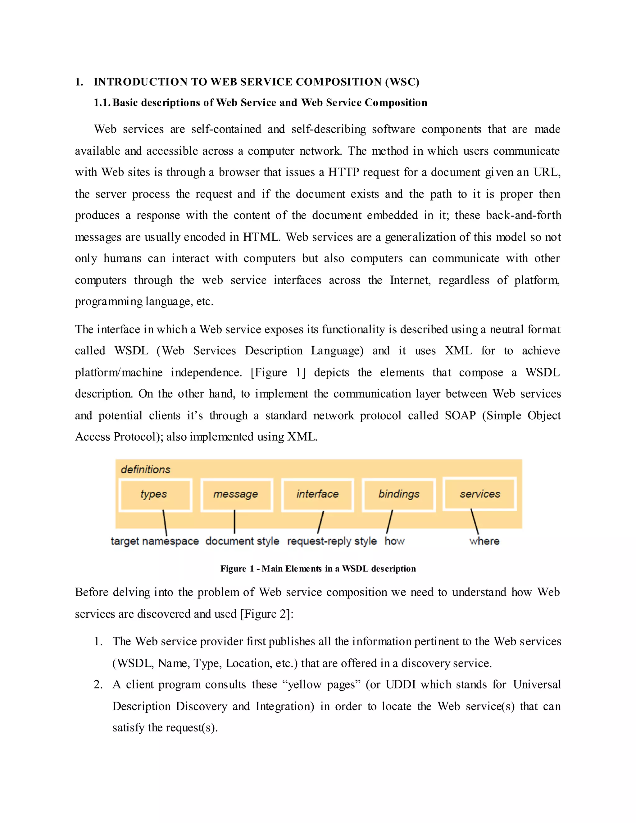 This document provides an overview of current challenges in automatic planning for web service composition. It defines key concepts like web services, web service composition, and discusses the need for automated composition. The document also presents formal models and definitions for the web service composition problem and classifications. It explores automatic planning techniques used in papers surveyed, including OWL-S based composition and planning as a state transition system. The document concludes with a discussion of approaches to validate automated web service composition.