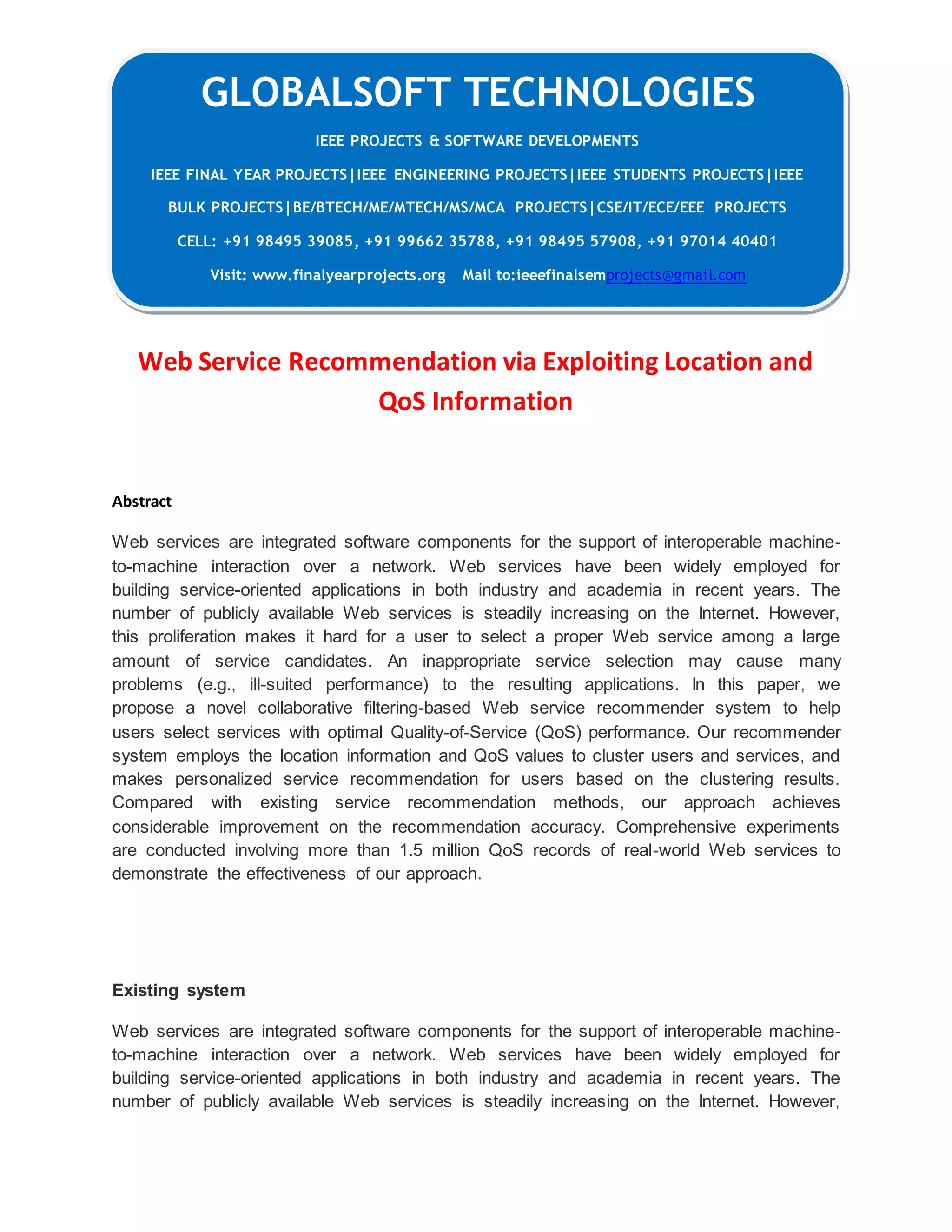 The document discusses a collaborative filtering-based web service recommender system designed to aid users in selecting services with optimal quality-of-service (QoS) performance amidst the growing number of publicly available web services. It highlights the use of location information and QoS values for clustering users and services, resulting in personalized recommendations with improved accuracy compared to existing methods. Comprehensive experiments involving over 1.5 million QoS records demonstrate the effectiveness of the proposed approach.