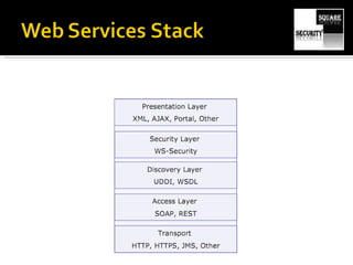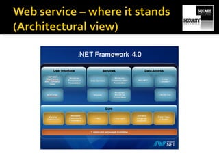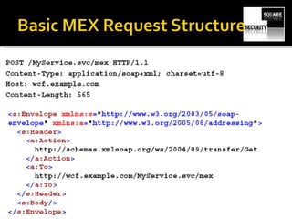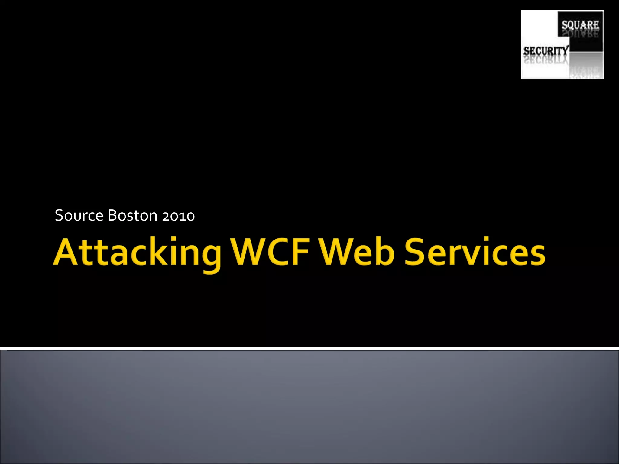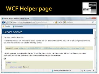 The document discusses testing the security of web services. It provides an overview of Windows Communication Foundation (WCF), explaining that it is Microsoft's framework for building networked applications and supports different protocols. It also discusses important concepts for WCF like addresses, bindings and contracts. The document then provides recommendations for tools to test WCF services, including WcfTestClient, WCF Storm and WSFuzzer, and discusses techniques like leveraging metadata and secure bindings.