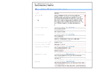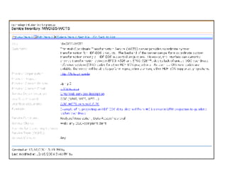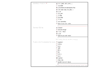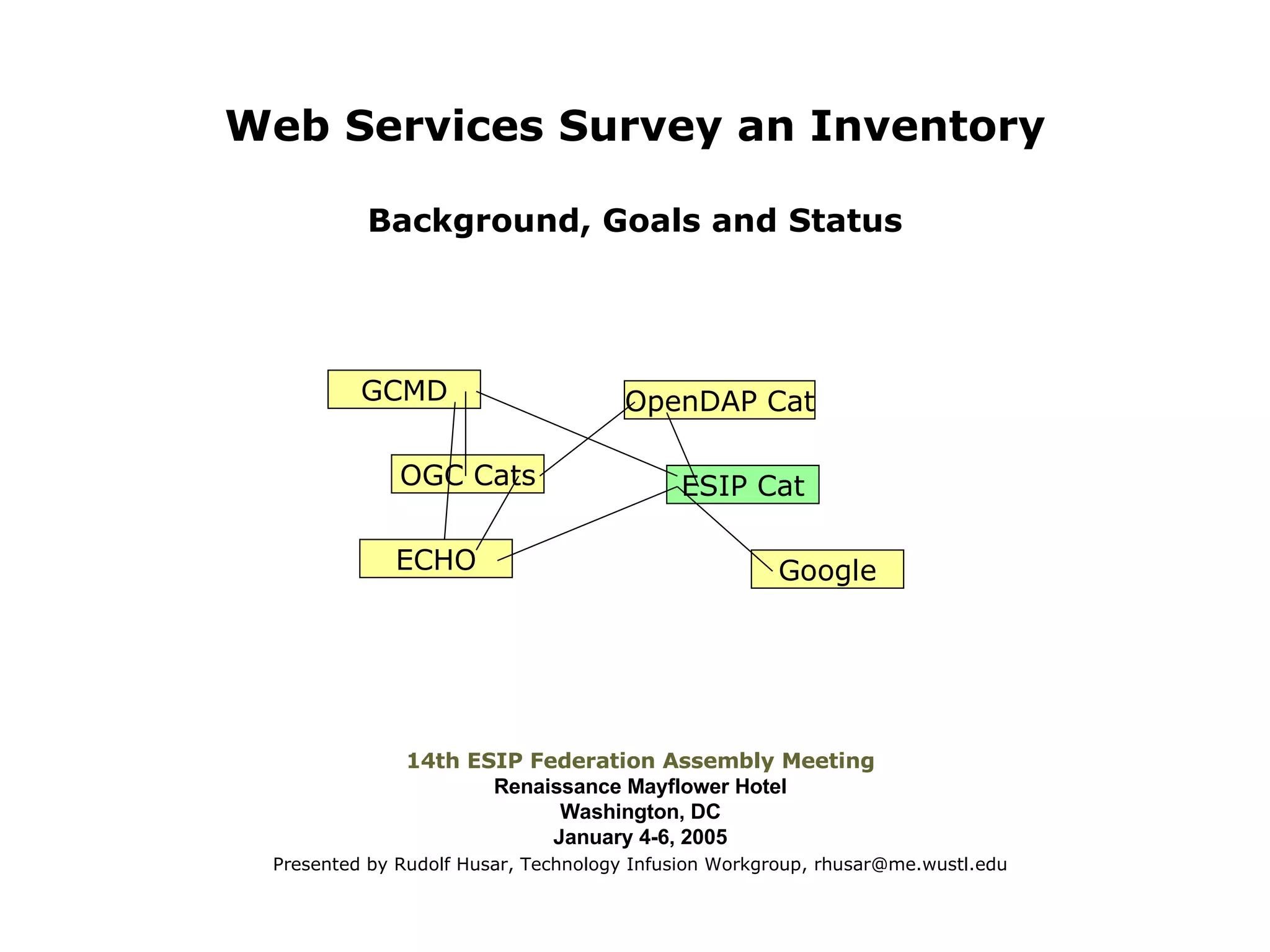 The document discusses a survey of web services being conducted by the ESIP Federation's Technology Infusion Workgroup. The goals of the survey are to assess the variety of web services available for accessing and manipulating earth science data, understand the protocols and standards used, and get a sense of how the services are currently being utilized. The survey will be implemented as a flexible web form on the workgroup's website to collect information from the community on available services. The results could eventually be integrated with existing service catalogs like GCMD and ECHO. The workgroup is also discussing approaches to demonstrate linking between different service catalogs.