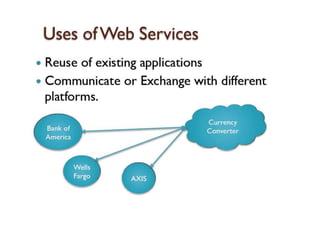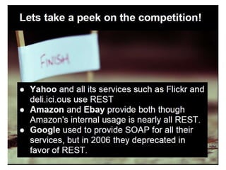 The document discusses web services, defining them as systems that enable data exchange between different systems. It contrasts SOAP and REST protocols, explaining how REST focuses on accessing resources through a consistent interface. The agenda also includes an application demo and a feedback session.