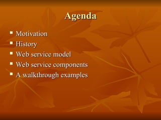 The document provides an introduction to web services, detailing their motivation, history, and components. It defines web services, highlights their role in enabling interoperability, and outlines the service model involving providers, registries, and requestors. Additionally, it covers key technologies such as XML, SOAP, WSDL, and UDDI, emphasizing their importance in web service communication and structure.