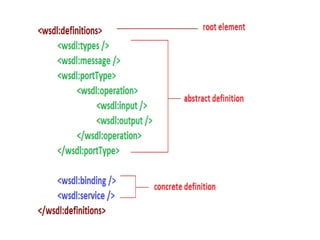 The document discusses key concepts related to web services including SOAP, WSDL, and UDDI. It defines web services as software that makes itself available over the internet using XML messaging. It describes SOAP as the messaging protocol that uses XML and HTTP for communication. WSDL provides an XML format to describe web services, including what functions they provide and how to access them. UDDI is a platform-independent registry where businesses can publish their web services to allow for discovery.