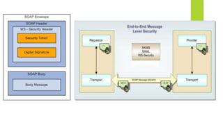 Web Services Security (WS-Security) is a proposed standard that addresses securing data exchanged as part of a web service. It provides authentication, authorization, confidentiality, integrity, and non-repudiation. Security can be implemented at the transport level using SSL/TLS to secure the communication channel, or at the message level by securing the SOAP message itself using standards like XML Encryption, XML Signature, and WS-Security. Transport level security secures the connection, while message level security secures individual messages and allows security to travel with the message between applications and intermediaries.