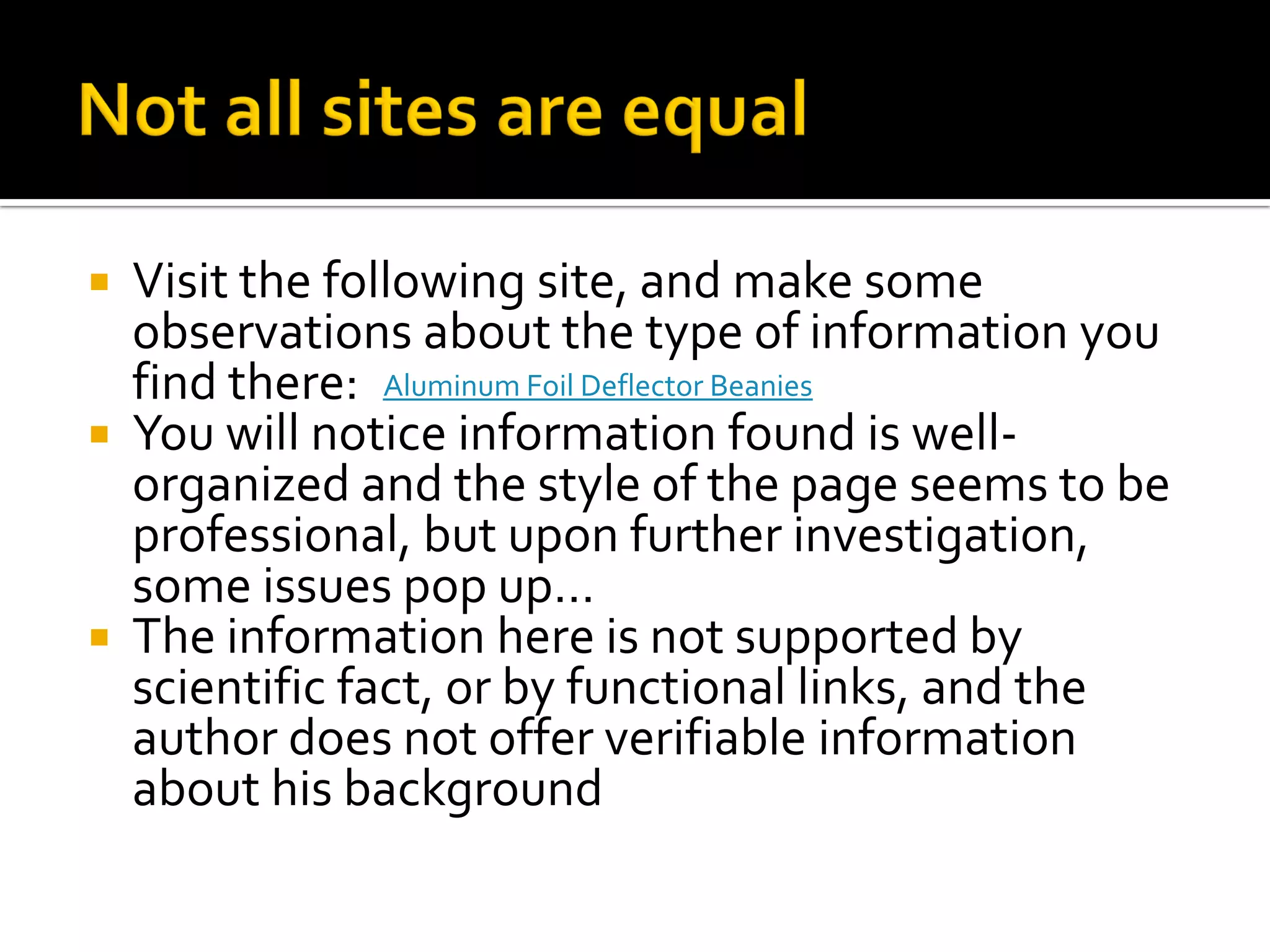The document discusses how to evaluate the reliability of online resources by examining who authored the content, what the purpose and type of site is, when it was last updated, where the information originated, and why the information should be considered valid. It provides questions to consider under each of these "Five Ws" categories and notes that .gov domains and sites from experts are generally most trustworthy sources of information.