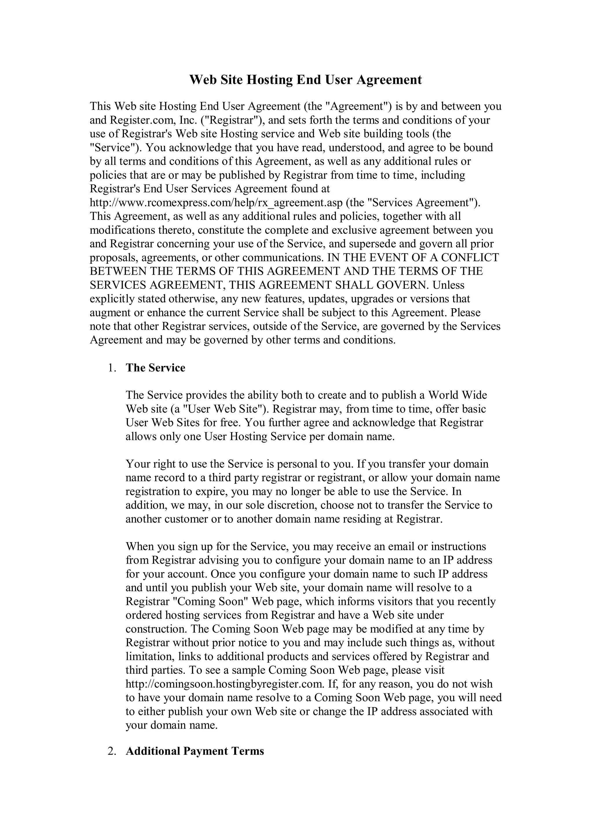 This document outlines the terms and conditions of a web site hosting end user agreement between a customer and Register.com. It details what the hosting service provides, restrictions on content, intellectual property rights, terms of service, and conditions for account suspension or termination. Customers must agree to only use the service legally and appropriately, and Register.com reserves the right to remove any content or suspend service that violates the terms.