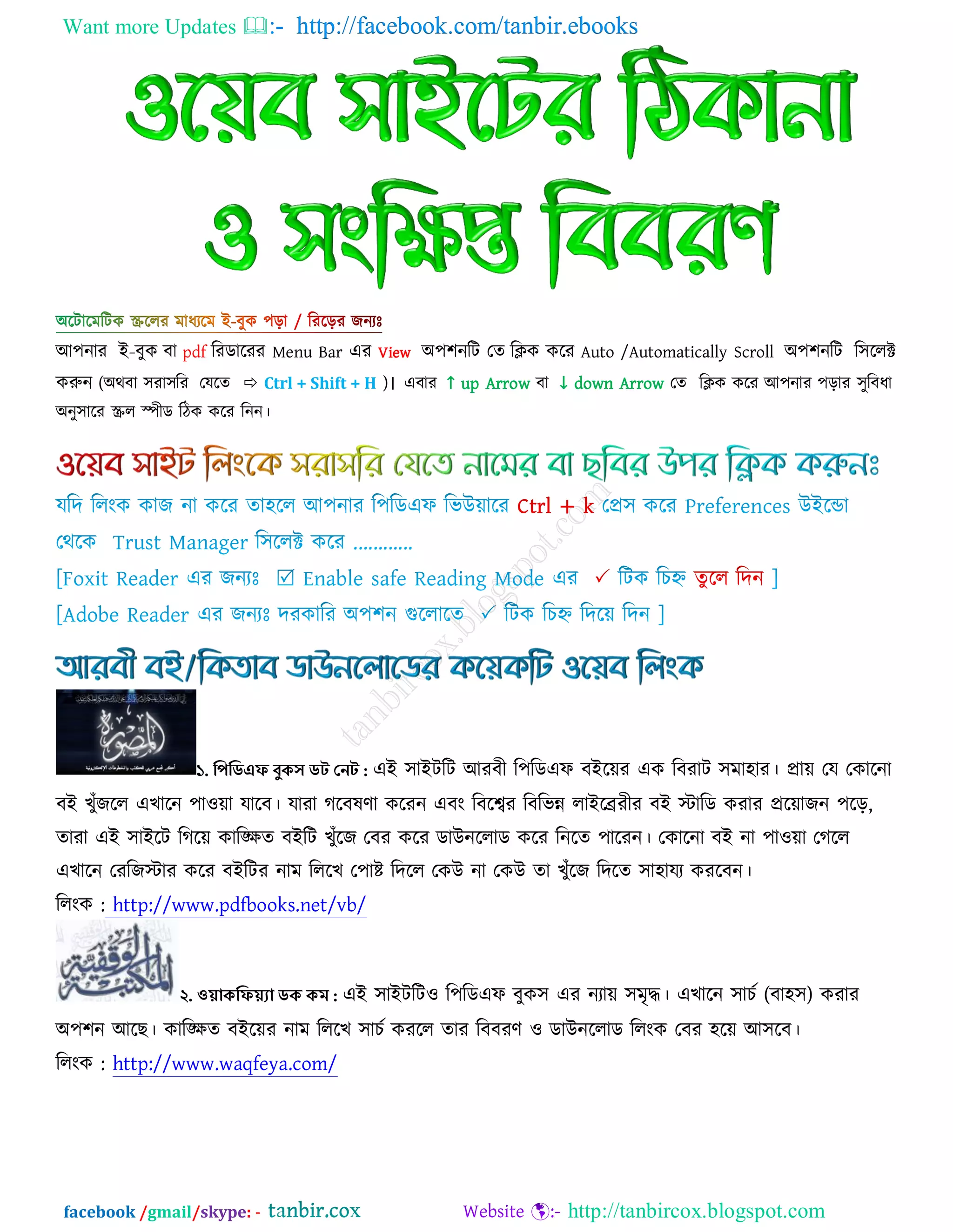 http://facebook.com/tanbir.ebooks facebook /gmail/skype: - http://tanbircox.blogspot.com অনায আ”ফুও ফা pdf রযডারযয Menu Bar এয View নরি তত রিও ওরয Auto /Automatically Scroll নরি রররক্ট ওরুন (থফা যারয তমরত Ctrl + Shift + H )। এফায ↑ up Arrow ফা ↓ down Arrow তত রিও ওরয অনায ড়ায ুরফধা নুারয স্ক্রর স্পীড রিও ওরয রনন। ১. পিপিএফ বুকস িট নেট : এআ াআিরি অযফী ররডএপ ফআরেয এও রফযাি ভাায। প্রাে তম তওারনা ফআ ঔুুঁচরর এঔারন াো মারফ। মাযা করফলণা ওরযন এফং রফরেয রফরবন্ন রাআরেযীয ফআ স্টারড ওযায প্ররোচন রড়, তাযা এআ াআরি রকরে ওারিত ফআরি ঔুুঁরচ তফয ওরয ডাঈনররাড ওরয রনরত ারযন। তওারনা ফআ না াো তকরর এঔারন তযরচস্টায ওরয ফআরিয নাভ রররঔ তাষ্ট রদরর তওঈ না তওঈ তা ঔুুঁরচ রদরত াাময ওযরফন। ররংও : http://www.pdfbooks.net/vb/ ২. ওয়াকপফয়যা িক কম : এআ াআিরি ররডএপ ফুও এয নযাে ভৃদ্ধ। এঔারন াঘচ (ফা) ওযায ন অরঙ। ওারিত ফআরেয নাভ রররঔ াঘচ ওযরর তায রফফযণ ডাঈনররাড ররংও তফয রে অরফ। ররংও : http://www.waqfeya.com/