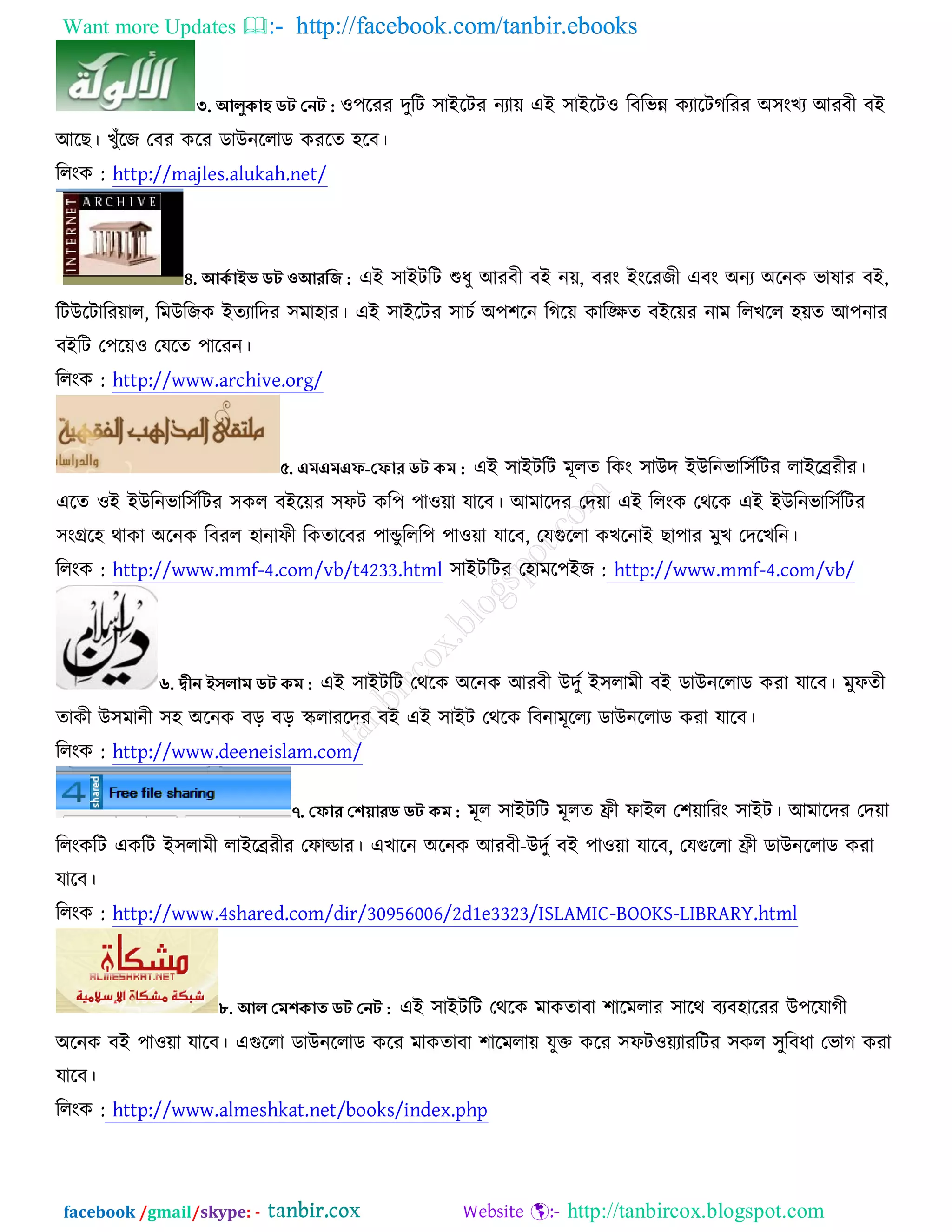 http://facebook.com/tanbir.ebooks facebook /gmail/skype: - http://tanbircox.blogspot.com ৩. আলুকাহ িট নেট : রযয দুরি াআরিয নযাে এআ াআরি রফরবন্ন ওযারিকরযয ংঔয অযফী ফআ অরঙ। ঔুুঁরচ তফয ওরয ডাঈনররাড ওযরত রফ। ররংও : http://majles.alukah.net/ ৪. আকক াইভ িট ওআরপি : এআ াআিরি শুধু অযফী ফআ নে, ফযং আংরযচী এফং নয রনও বালায ফআ, রিঈরিারযোর, রভঈরচও আতযারদয ভাায। এআ াআরিয াঘচ রন রকরে ওারিত ফআরেয নাভ ররঔরর েত অনায ফআরি তরে তমরত ারযন। ররংও : http://www.archive.org/ ৫. এমএমএফ-নফার িট কম : এআ াআিরি ভূরত রওং াঈদ আঈরনবারচরিয রাআরেযীয। এরত আ আঈরনবারচরিয ওর ফআরেয পি ওর াো মারফ। অভারদয তদো এআ ররংও তথরও এআ আঈরনবারচরিয ংগ্রর থাওা রনও রফযর ানাপী রওতারফয ান্ডুররর াো মারফ, তমগুররা ওঔরনাআ ঙাায ভুঔ তদরঔরন। ররংও : http://www.mmf-4.com/vb/t4233.html াআিরিয তাভরআচ : http://www.mmf-4.com/vb/ ৬. দ্বীে ইসলাম িট কম : এআ াআিরি তথরও রনও অযফী ঈদুচ আরাভী ফআ ডাঈনররাড ওযা মারফ। ভুপতী তাওী ঈভানী রনও ফড় ফড় স্করাযরদয ফআ এআ াআি তথরও রফনাভূররয ডাঈনররাড ওযা মারফ। ররংও : http://www.deeneislam.com/ ৭. নফার নেয়ারি িট কম : ভূর াআিরি ভূরত ফ্রী পাআর তোরযং াআি। অভারদয তদো ররংওরি এওরি আরাভী রাআরেযীয তপাল্ডায। এঔারন রনও অযফী-ঈদুচ ফআ াো মারফ, তমগুররা ফ্রী ডাঈনররাড ওযা মারফ। ররংও : http://www.4shared.com/dir/30956006/2d1e3323/ISLAMIC-BOOKS-LIBRARY.html ৮. আল নমেকাত িট নেট : এআ াআিরি তথরও ভাওতাফা ারভরায ারথ ফযফারযয ঈরমাকী রনও ফআ াো মারফ। এগুররা ডাঈনররাড ওরয ভাওতাফা ারভরাে মুক্ত ওরয পিেযাযরিয ওর ুরফধা তবাক ওযা মারফ। ররংও : http://www.almeshkat.net/books/index.php