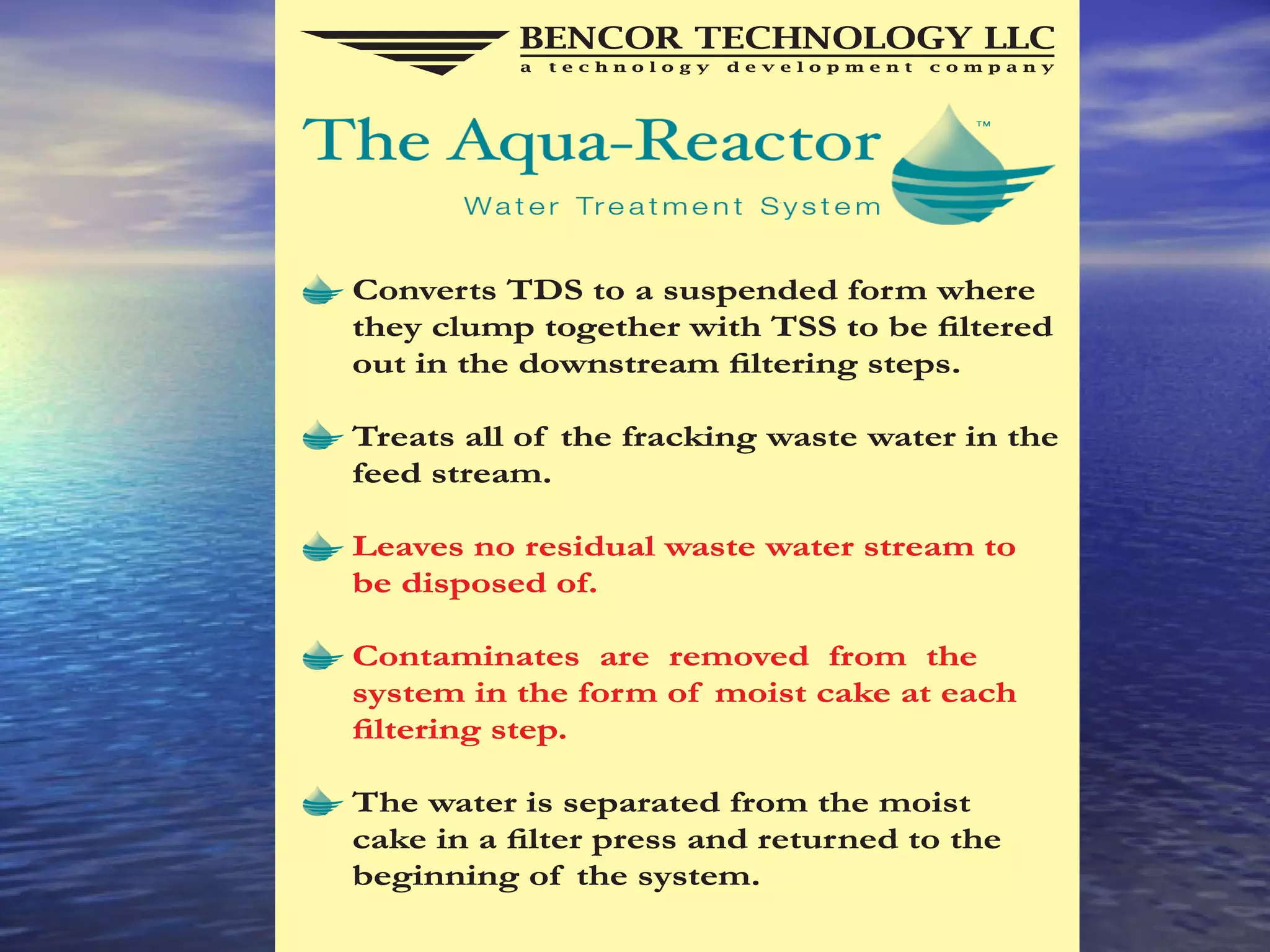 This document summarizes a water purification system called the Aqua-ReactorTM. It can purify highly contaminated waste water, such as from fracking operations, to drinking water standards without producing secondary waste. The system combines existing technologies in a novel way. Specifically, it uses the Aqua-ReactorTM as a pre-treatment step to allow downstream components to work more efficiently. Independent tests showed the system reduced total dissolved solids in fracking waste water from over 100,000 mg/L to under 1,200 mg/L. It has applications for various water treatment needs like fracking waste, pharmaceuticals, and more.