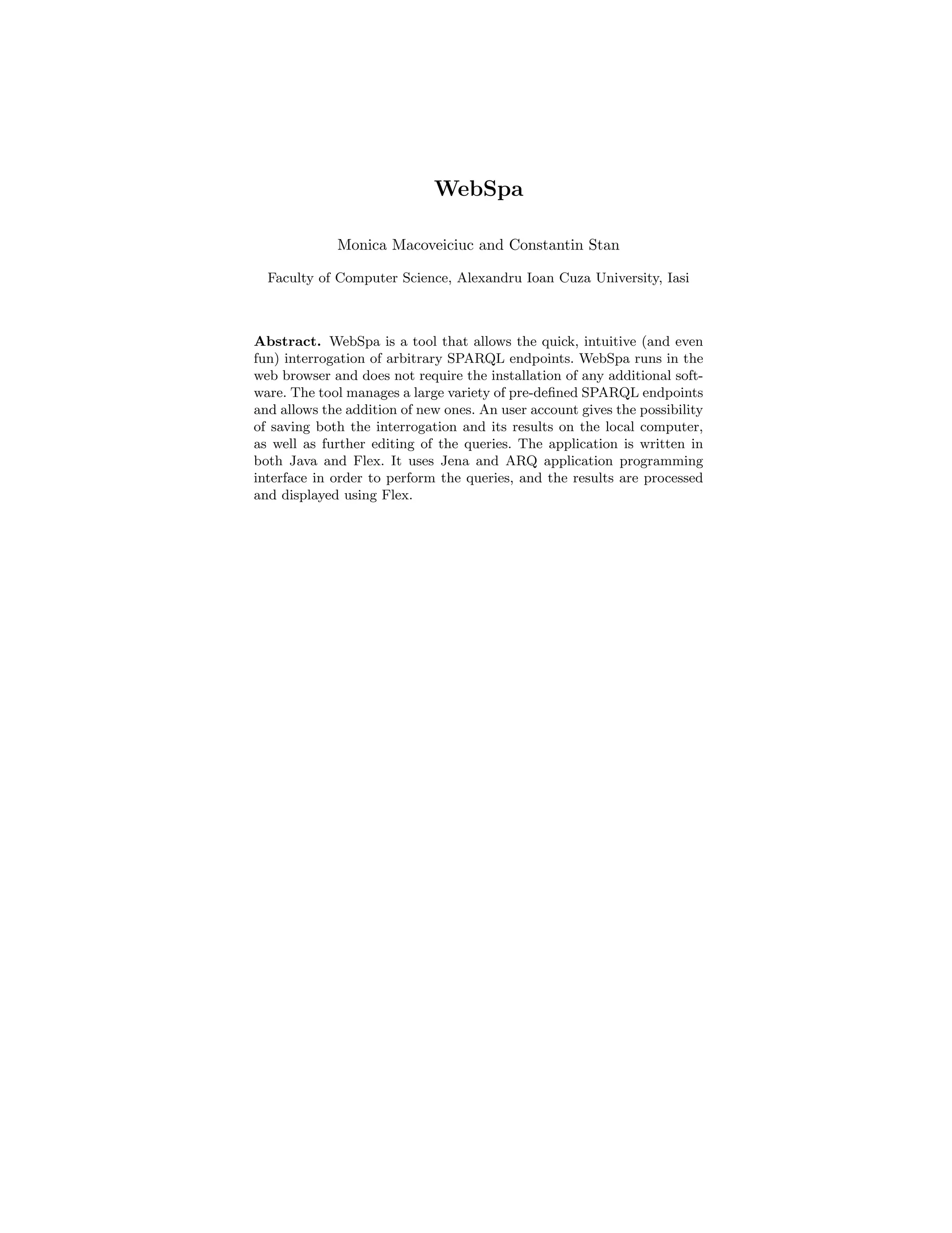 Webspa is a web-based tool designed for the intuitive interrogation of SPARQL endpoints, requiring no installation and offering features like saving queries and results for registered users. The application utilizes Java and Flex technology to manage multiple SPARQL endpoints, providing an easy-to-use interface for query execution and result management. The document describes the development, functionality, and technologies used in building Webspa, which significantly aids in accessing and manipulating semantic web data.