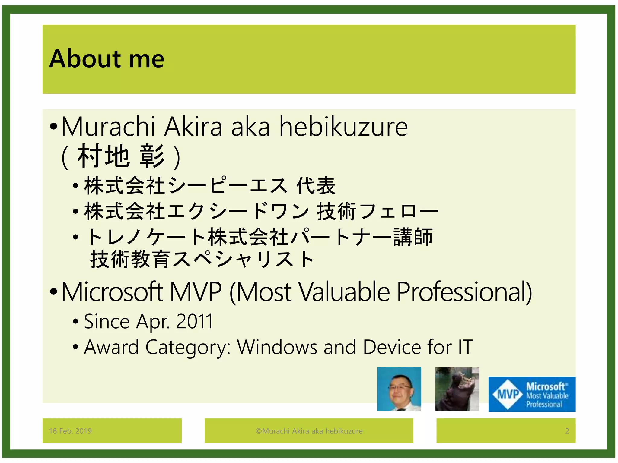 aka hebikuzure ( 村地 彰 ) • 株式会社シーピーエス 代表 • 株式会社エクシードワン 技術フェロー • トレノケート株式会社パートナー講師 技術教育スペシャリスト •Microsoft MVP (Most Valuable Professional) • Since Apr. 2011 • Award Category: Windows and Device for IT 16 Feb. 2019 ©Murachi Akira aka hebikuzure 2