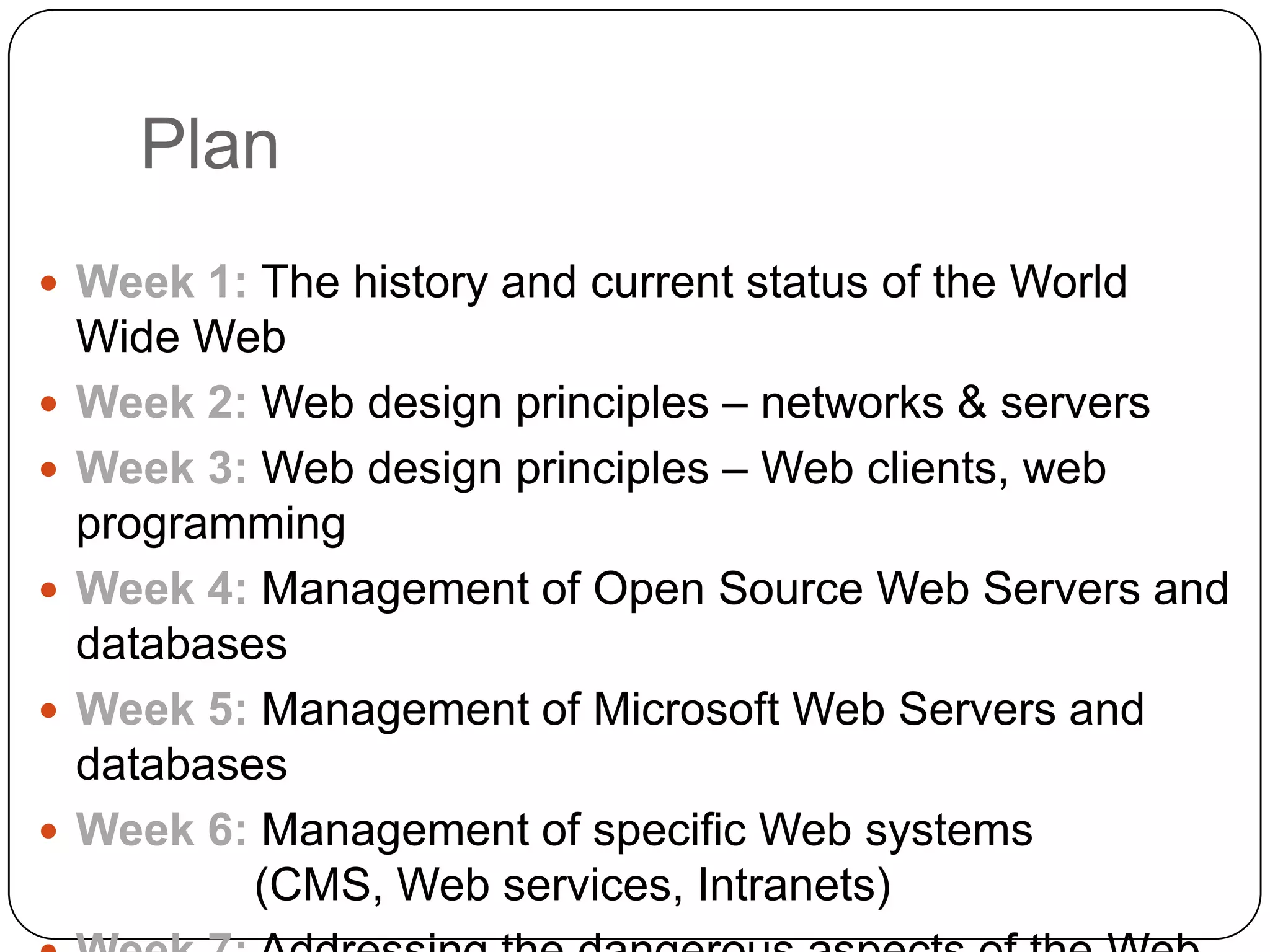 The document outlines a 7-week course on web technology management. Week 1 covers the history and current status of the World Wide Web. Weeks 2-3 cover web design principles related to networks, servers, clients, and programming. Weeks 4-5 cover management of open source and Microsoft web servers and databases. Week 6 covers specific web systems like content management systems and intranets. Week 7 addresses security issues on the web. The document also references architectural principles of the internet and web, including protocols like TCP/IP and DNS. It discusses the domain name system and how DNS translates names to IP addresses to locate devices on the internet.
