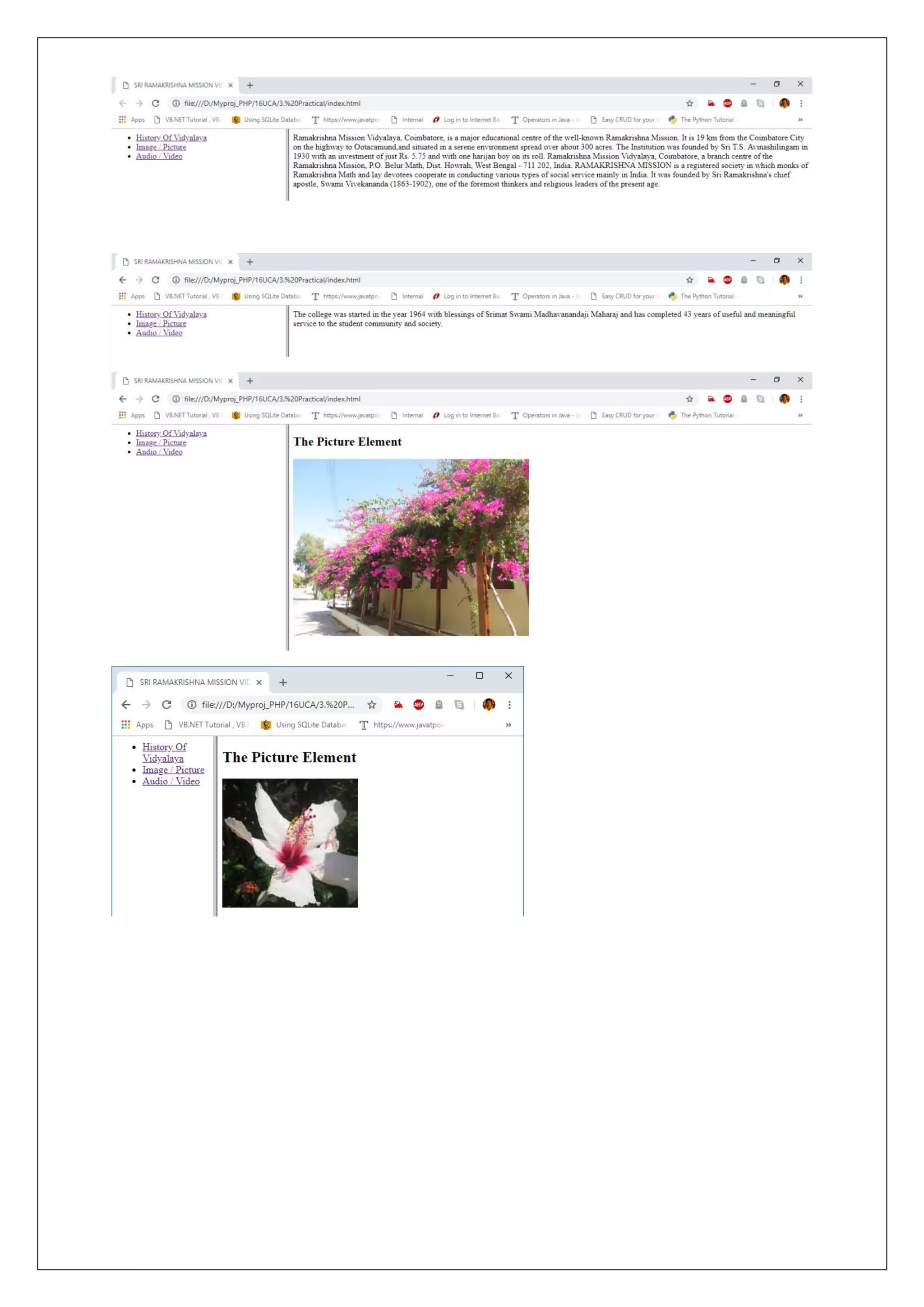 The document contains instructions for a semester practical exam for a Web Technology subject at Sri Ramakrishna Mission Vidyalaya College of Arts and Science. It includes a bonafide certificate, list of programs to be completed for the exam, and details of one program - a HTML5 program to create a student information form.