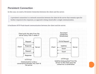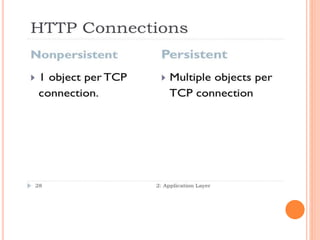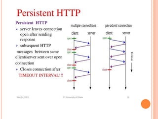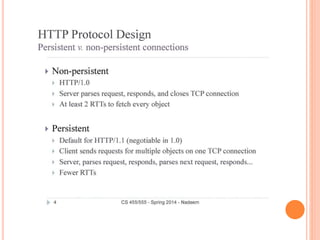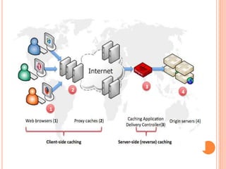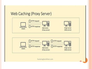 The document discusses web technologies including three-way and four-way handshaking for establishing client-server connections and contrasting non-persistent and persistent HTTP connections. It also covers web caching techniques to improve quality of service, the role of proxy servers in managing traffic, and cache consistency mechanisms for maintaining updated content. Additionally, it addresses the limitations of proxy servers regarding dynamically generated content and frequent updates.