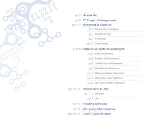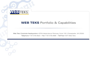 Web Teks provides a variety of web development and IT services including branding and creative design, enterprise web development, SharePoint and .NET development, and hosting services. They have experience building websites from scratch and integrating custom software with existing infrastructure. Their team of over 60 professionals can help clients with projects large and small across various industries.