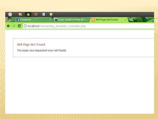 Dokumen tersebut membahas tentang penggunaan template pada CodeIgniter. Template digunakan untuk memisahkan tampilan dari logika program agar perubahan tampilan dan konten dapat dilakukan dengan mudah. Langkah-langkah penerapan template meliputi pembuatan library template, view template layout, view bagian-bagian template, serta controller.