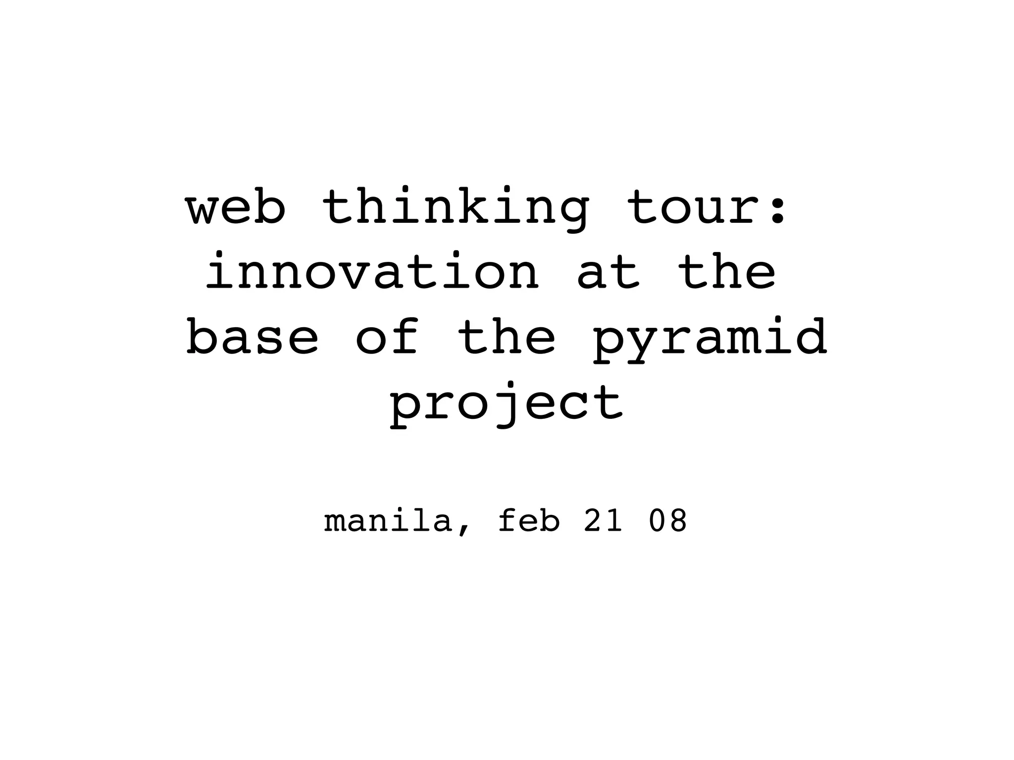 This document outlines ideas for developing an open platform for information sharing and learning to support innovation at the base of the pyramid. It discusses 5 trends in ICT, presents 3 case studies, and proposes developing the basics, an 80/20 solution, and using the network as an open platform for sharing and learning. The overall goal is to imagine how to connect communities and support rural health care, education, and other services through open information sharing.