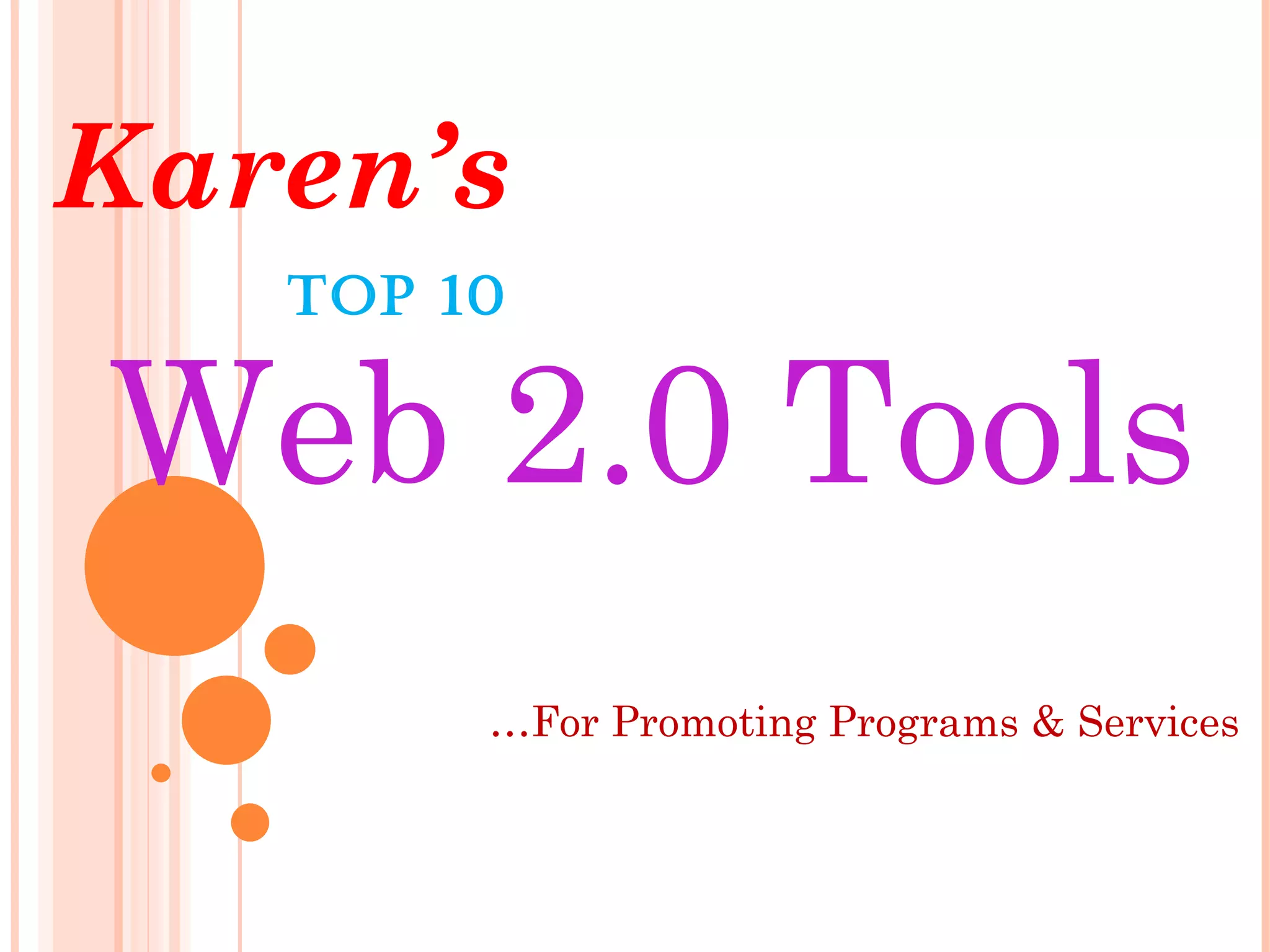 The document provides a list of the top 10 Web 2.0 tools that can be used to promote library programs and services, along with examples and considerations for each tool. It discusses using tools like Facebook, book trailers, surveys, Glogs, wikis, Twitter, webinars, YouTube channels, and blogs. For each tool, it highlights potential benefits like engaging students, sharing resources, and gathering feedback, as well as possible downsides like copyright issues, overwhelming content, and technical learning curves. It emphasizes cross-promoting content across multiple tools to reach wider audiences.