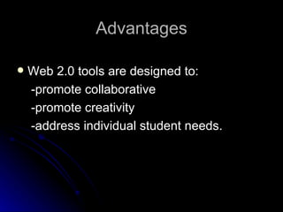The document discusses various web tools that teachers can use to promote collaboration, creativity, and address individual student needs. It identifies presentation tools like Prezi and Glogster, visualization tools such as web whiteboards and graph creators, and writing tools like Penzu and Essay Map. The tools are designed to make lessons visually compelling and allow students to organize and map their knowledge.